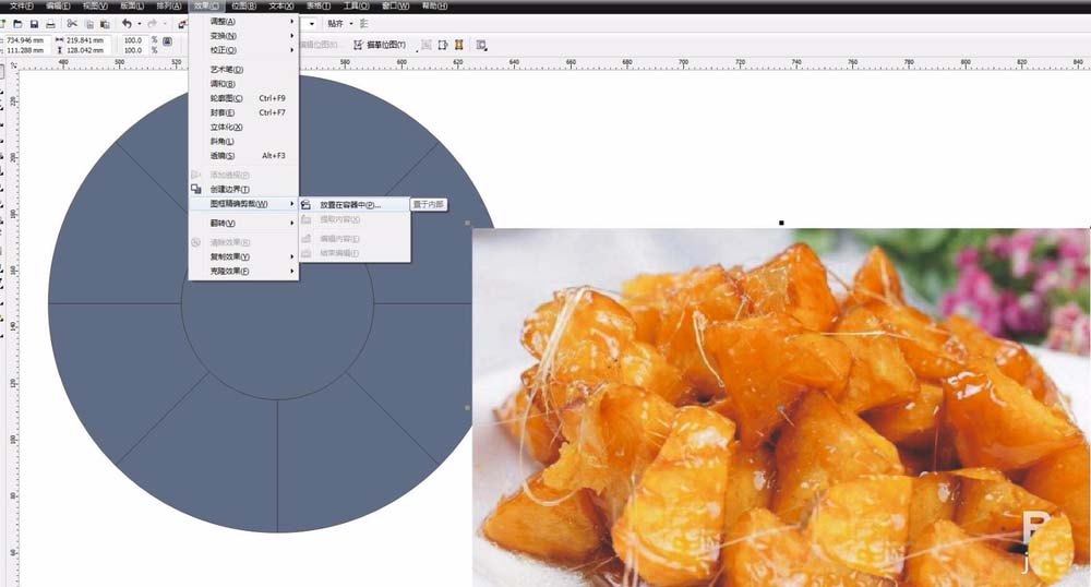 7、然后将图片导入进来,选择一张图片执行,效果——图框剪裁——至于图文框内部。然后对图片进行编辑,调整到适合的大小。同样的操作,将其他图片都放入小格子中。完成。