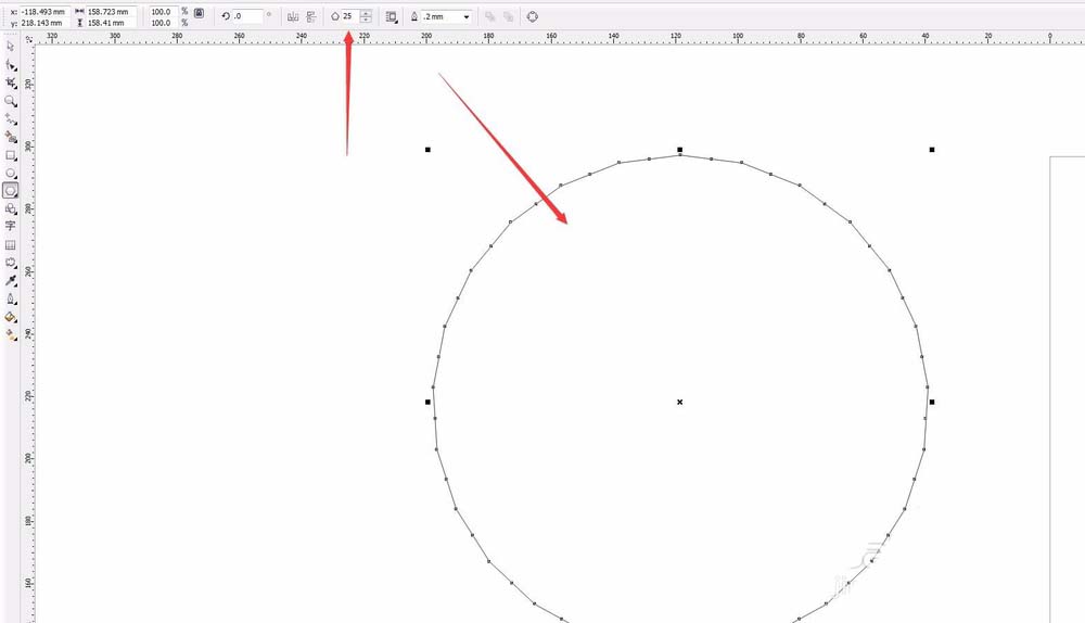 2、然后在属性栏中可以对多边形进行修改,比如我不想要五边形,我想要一个复杂一点点图形,我将边数设置为25。可以得到下图的效果,已经接近一个圆形了。