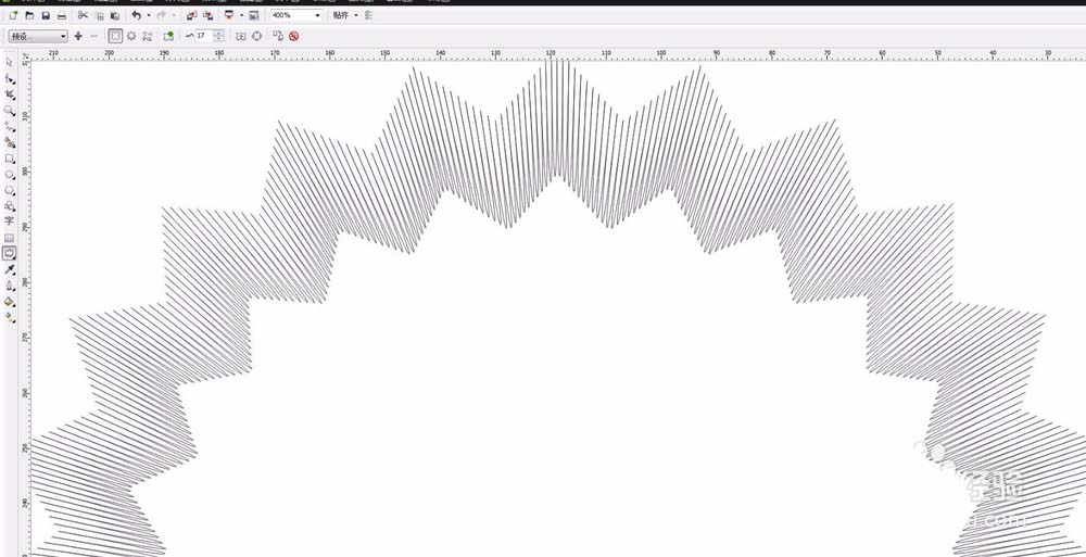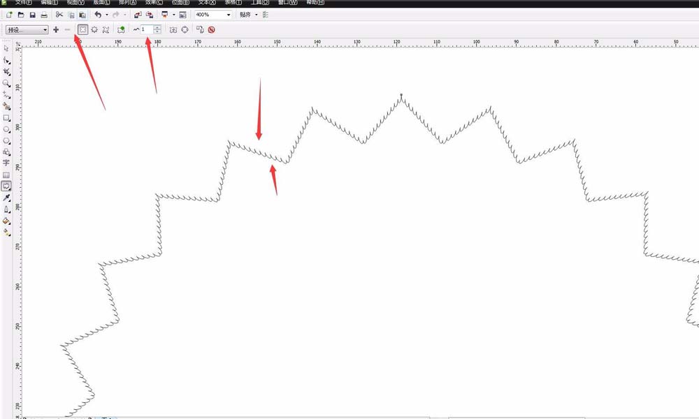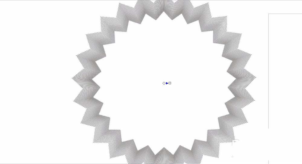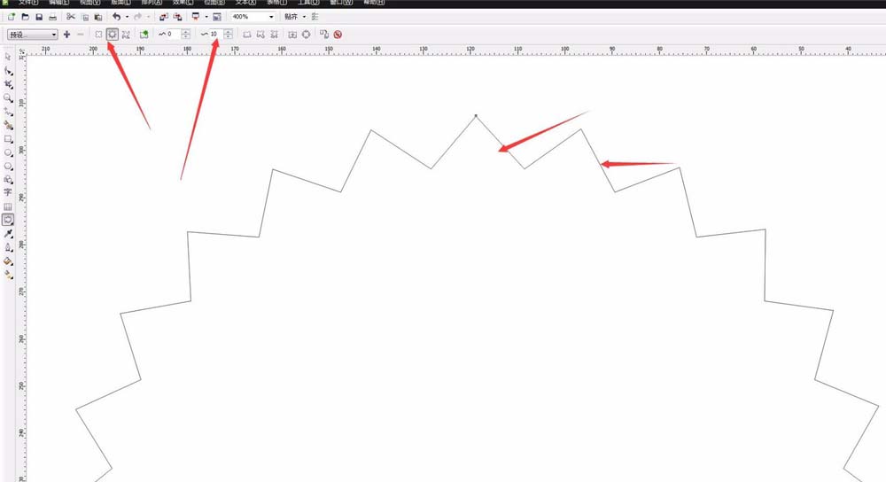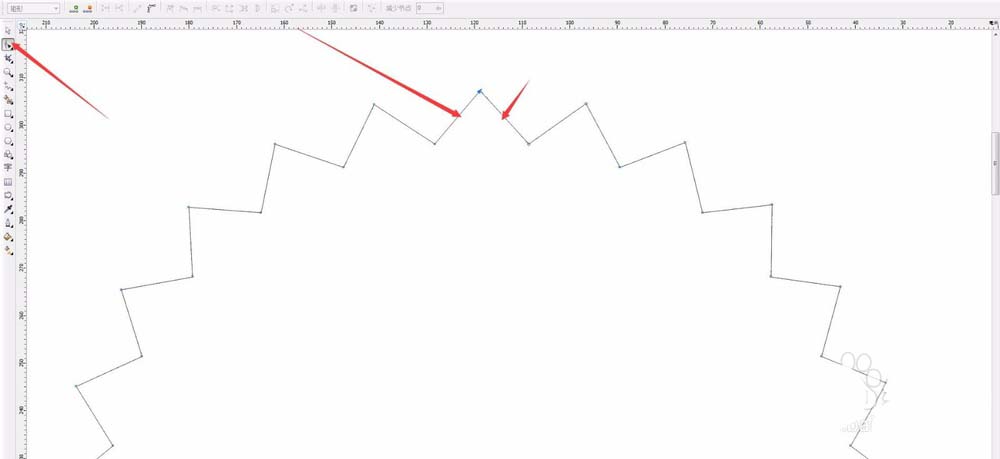 3、放大观察,用形状工具,选择其中的一个节点,向上拖动,可以看到图形发生了变化,我们只是选中了一个节点,所有的节点,隔一个就发生了不一样的变化。变成了下图的效果。