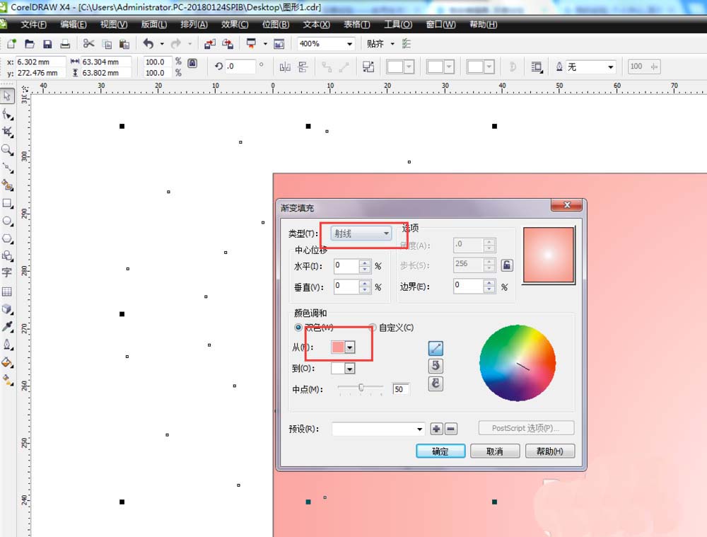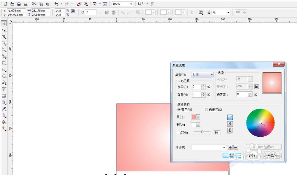 7、去掉轮廓色,填充渐变粉色,射线渐变,如图