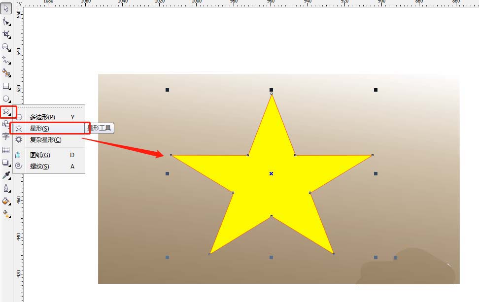 2、选择星形工具绘制一个五角星,并填充黄色,边框填充红色。