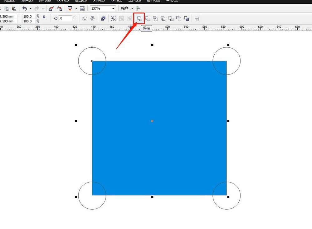 5、任意选择其中一个圆形,并按住键盘shift键,鼠标单击一下方形。此时两个图形都被选中,点击菜单栏上面的“焊接”命令。