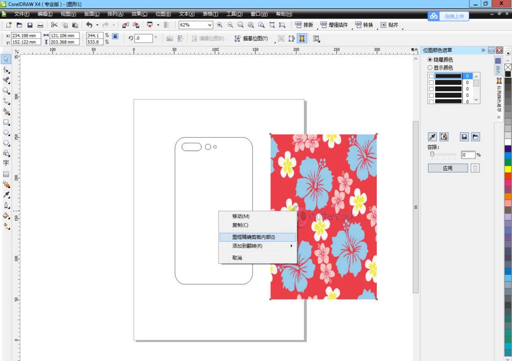 5、右键拖住图片放在手机壳内选择图框精确裁剪内部。