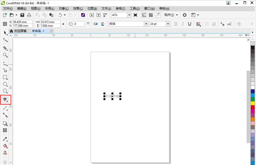 1、打开CDR,新建一个画板,在左侧点击篇【文字工具】,在页面中点击一下,输入想要修改的文字。