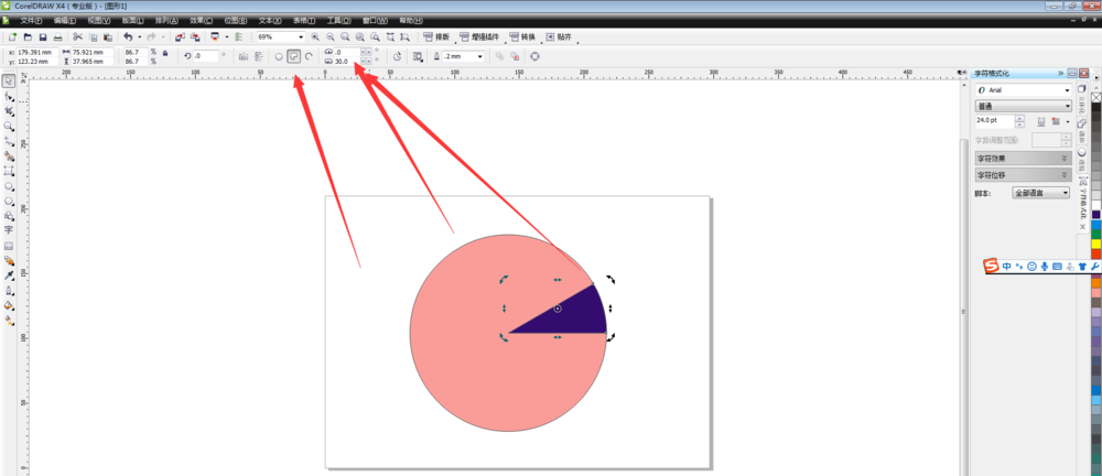 4、给复制的椭圆填充另一种颜色,选择饼形,在起始角度中输入0,结束角度中输入30,如下图
