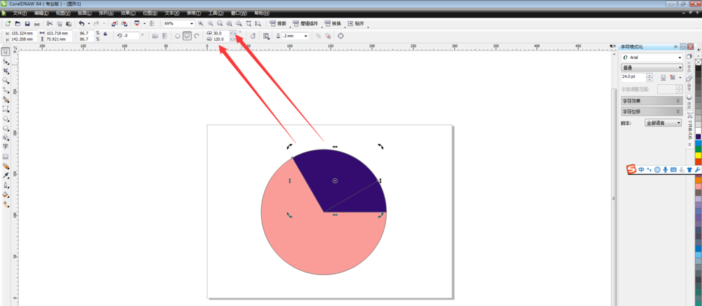 5、选择30度的这个圆,按Ctrl+c ctrl +v,进行复制,在起始角度中输入30,结束角度中输入120,然后换个填充颜色,如下图。