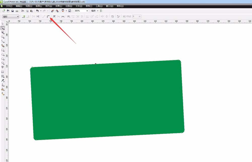 3、因为是儿童类的文案,所以在矩形的形式上,可以稍微改动一下,变得可爱圆滑一点。选择矩形CTRL+Q转化为曲线。选择任意一条边,在属性栏中转化为曲线。然后稍微拖动一点点。如下图