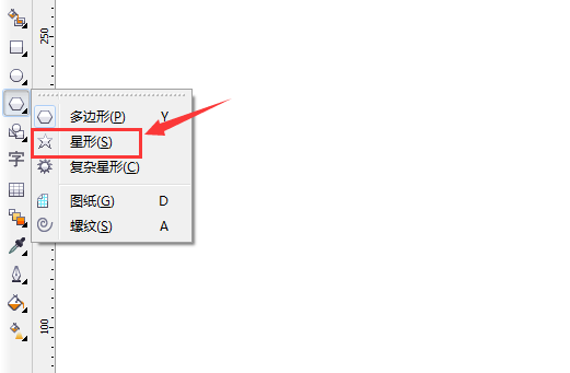 1、打开cdr之后在cdr的工具箱内找到多边形选项,点击该选项在其下拉列表里找到星形选项,如图所示:
