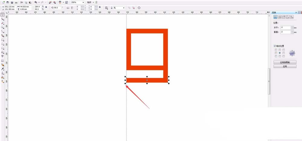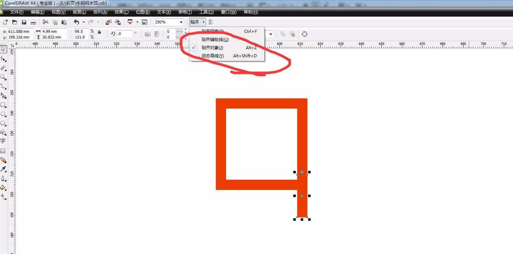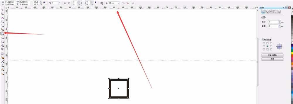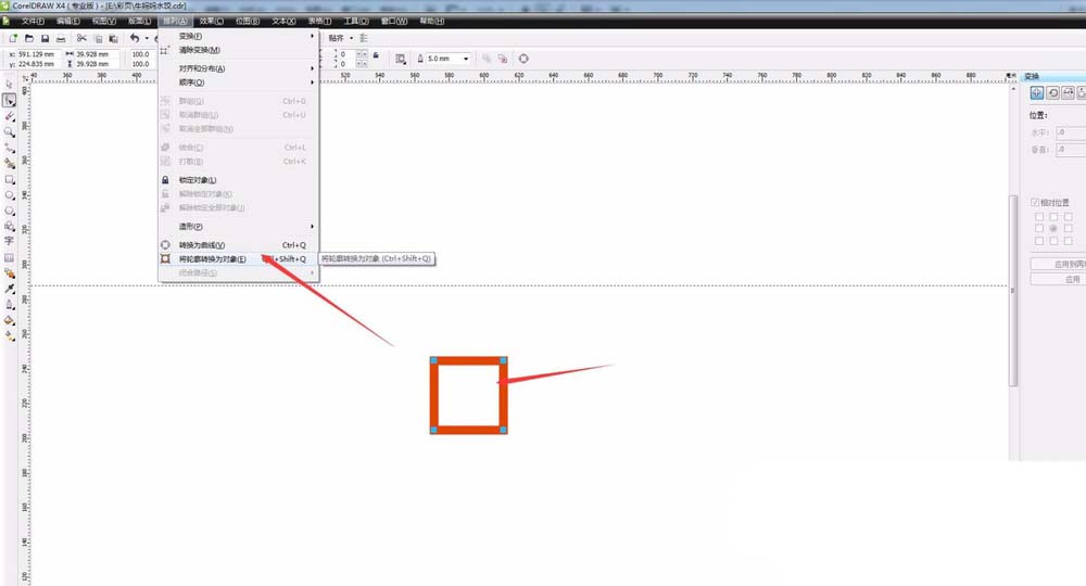 3、选中正方形,将轮廓线转化为对象。在排列菜单中找到将轮廓转化为对象命令。这样就不是线了,然后在属性栏中有一个贴齐的图标,选择贴齐对象。绘制一个跟正方形的边等宽的矩形