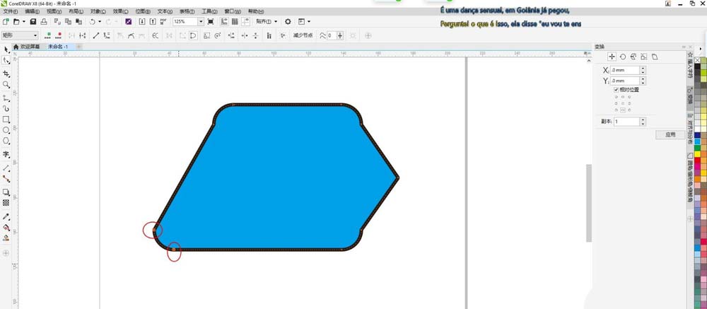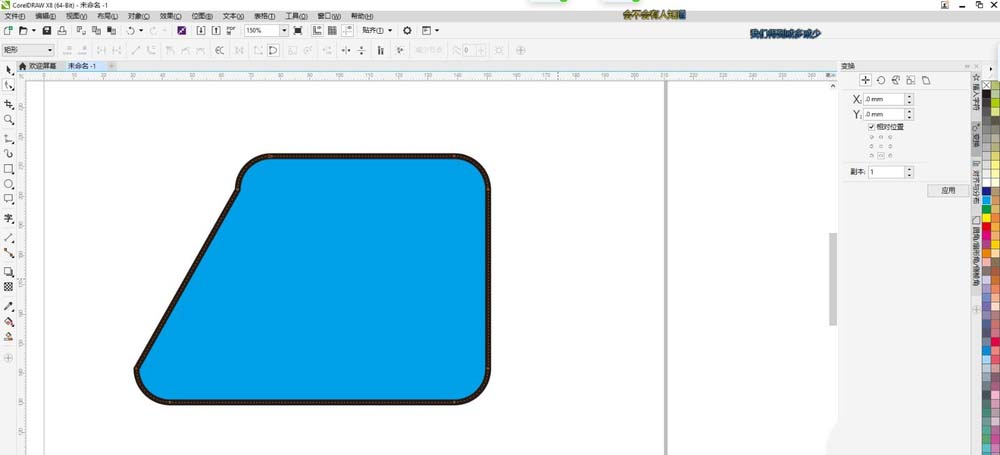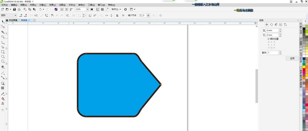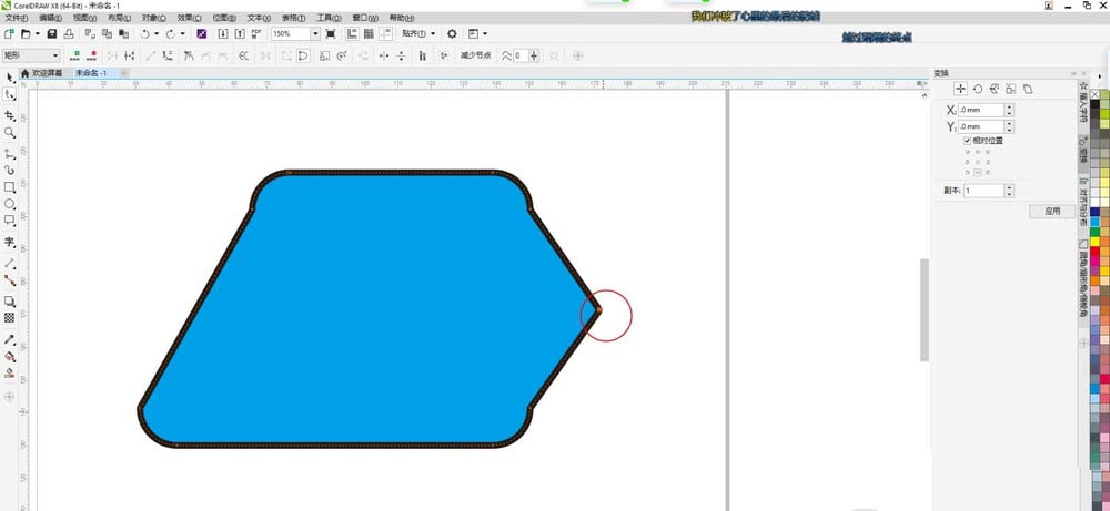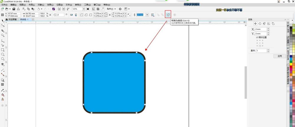 2、点击属性栏的转曲工具,或用快捷键CTRL+Q把图形转曲线,转曲后则可以进行自由变换,点击图形任一边加上一个节点,拉动节点,则改变了图形形状。