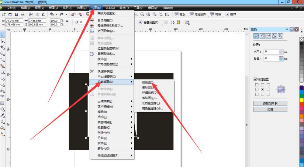 4、单击字体,选择位图——轮廓描摹——线条图,转成线条图、颜色黑白两色。