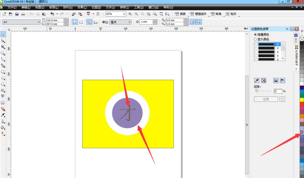 3、复制一个圆,等比放小,填充不同颜色,居中对齐。并在中部放上需要的字