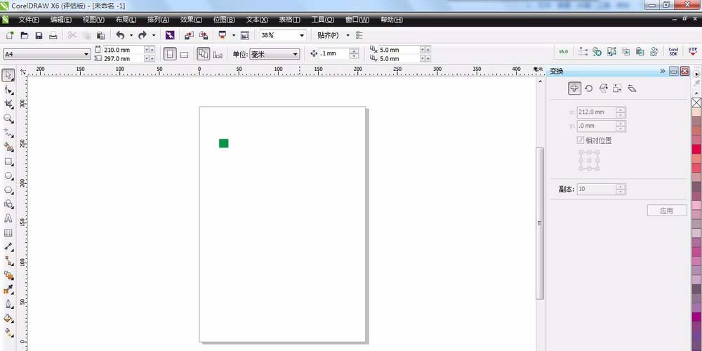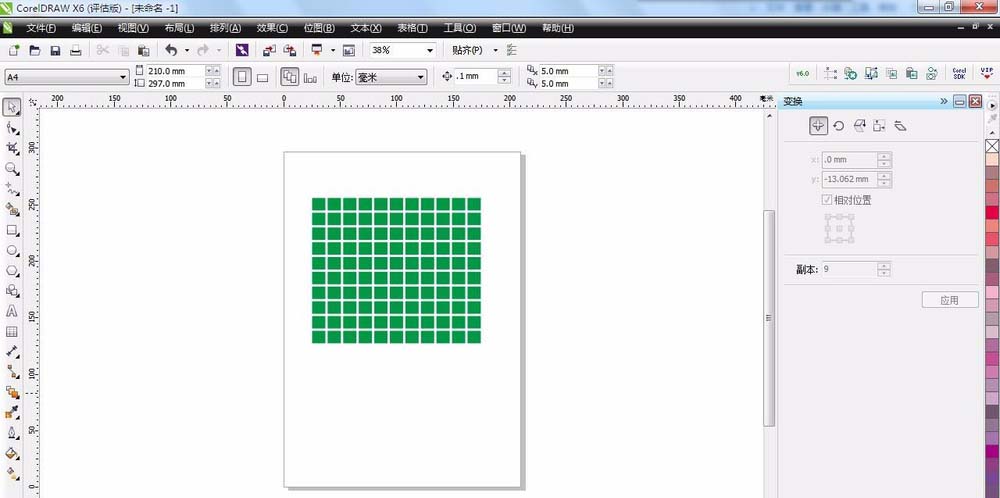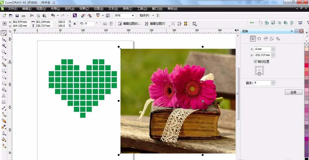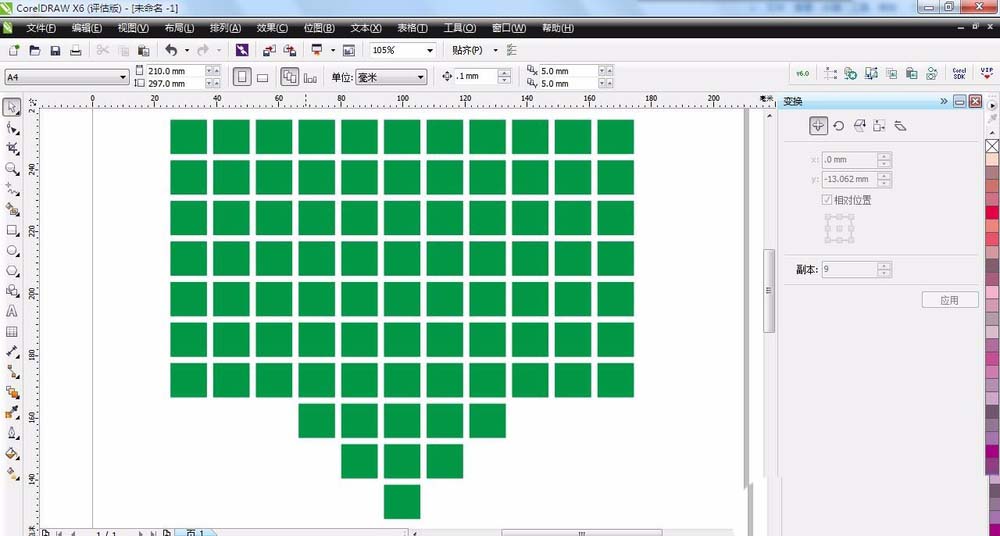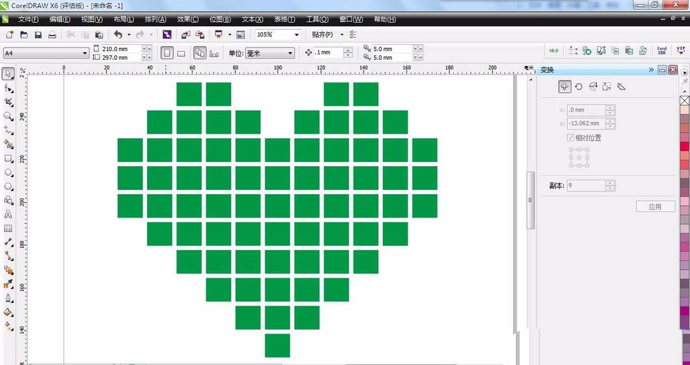 2、复制出多个矩形以备制作心形。点击任务栏“排列”——“变换”——“位置”。在位置对话框,选择要复制的方向,下面有个可以调整 的数字,是你要复制出的个数。这里横向设为10,纵向设为9.