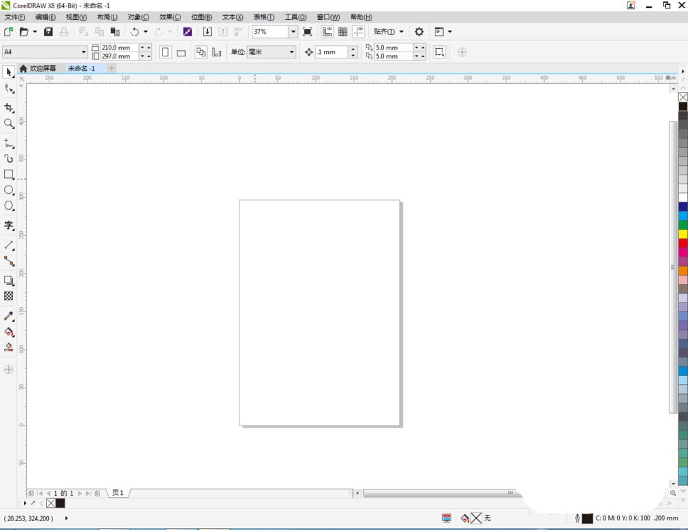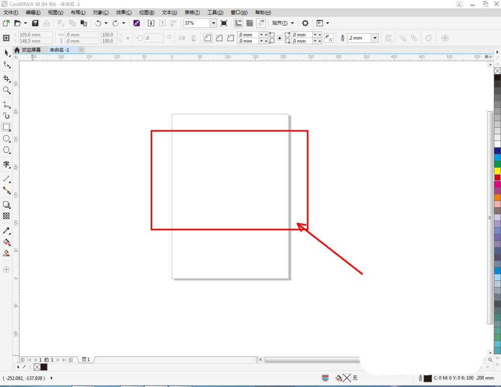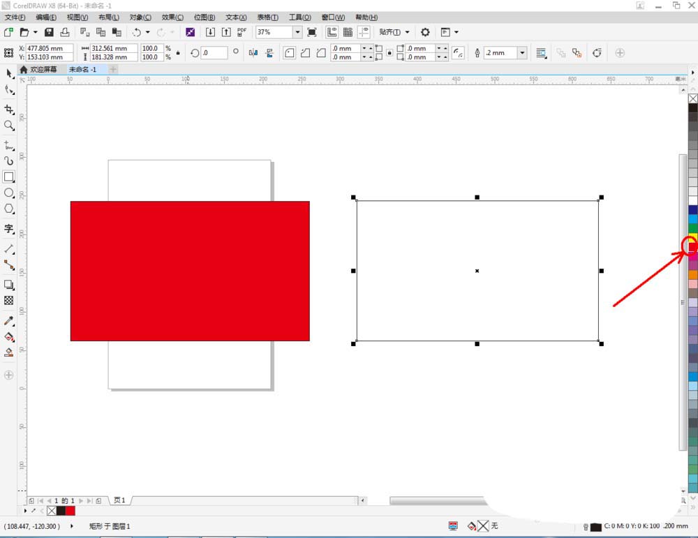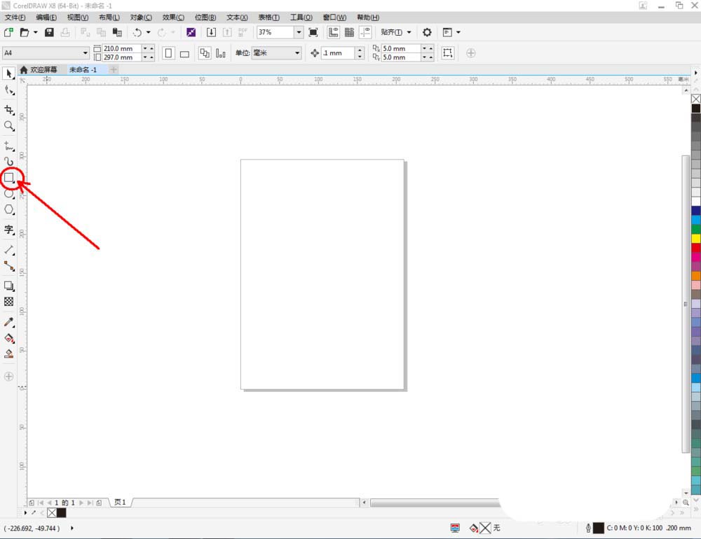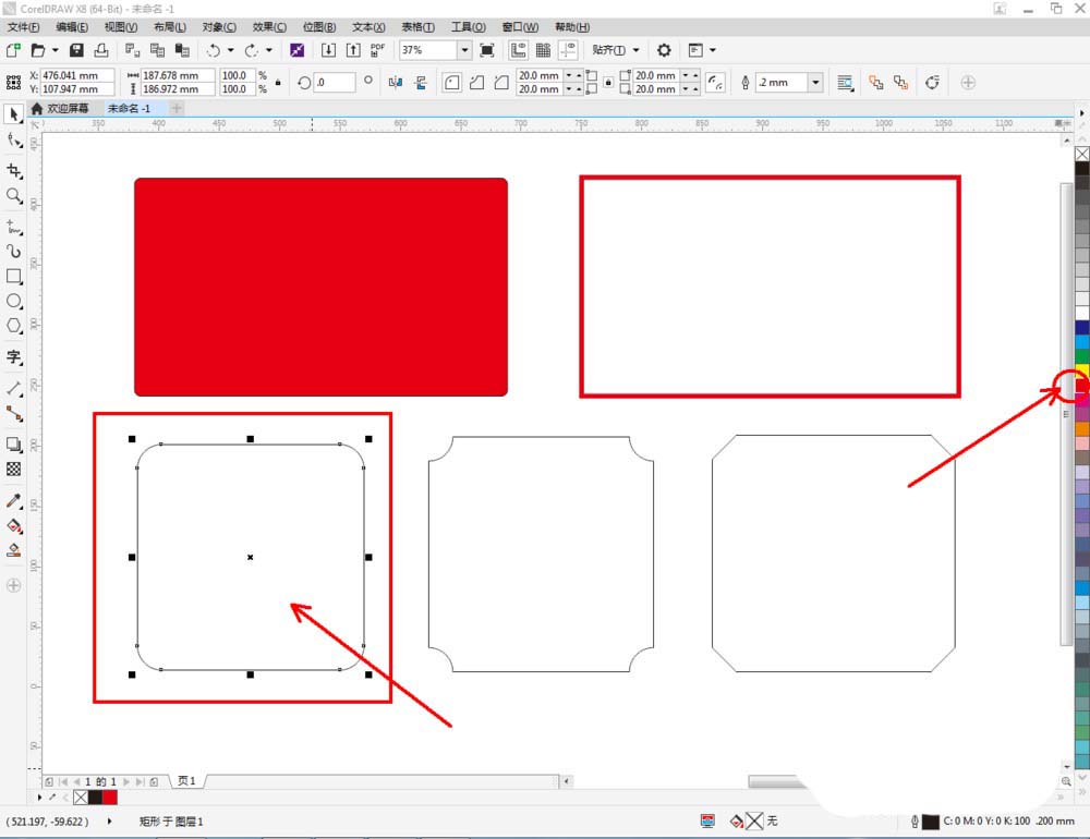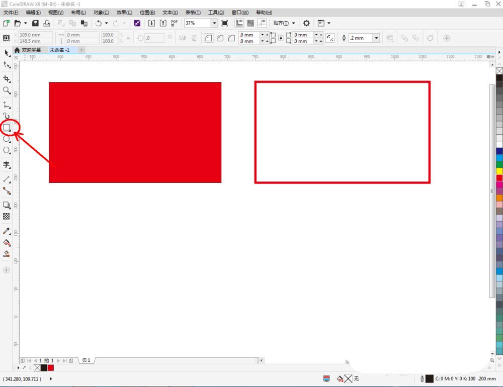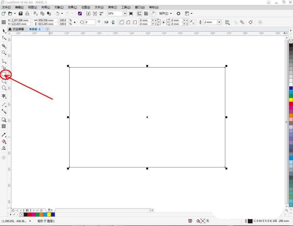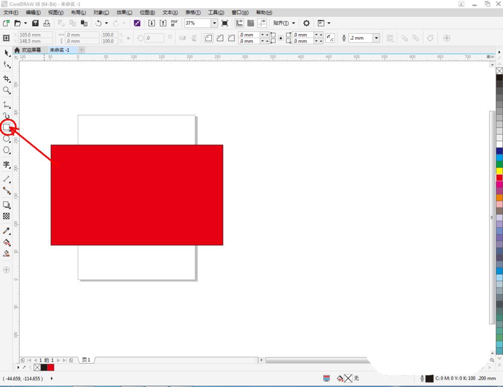 1、打开CorelDRAW X8软件,点击【矩形工具】,在作图区域绘制一个矩形图案。鼠标左键点击右边色板中的红色,可以绘制出一个红色矩形图案;