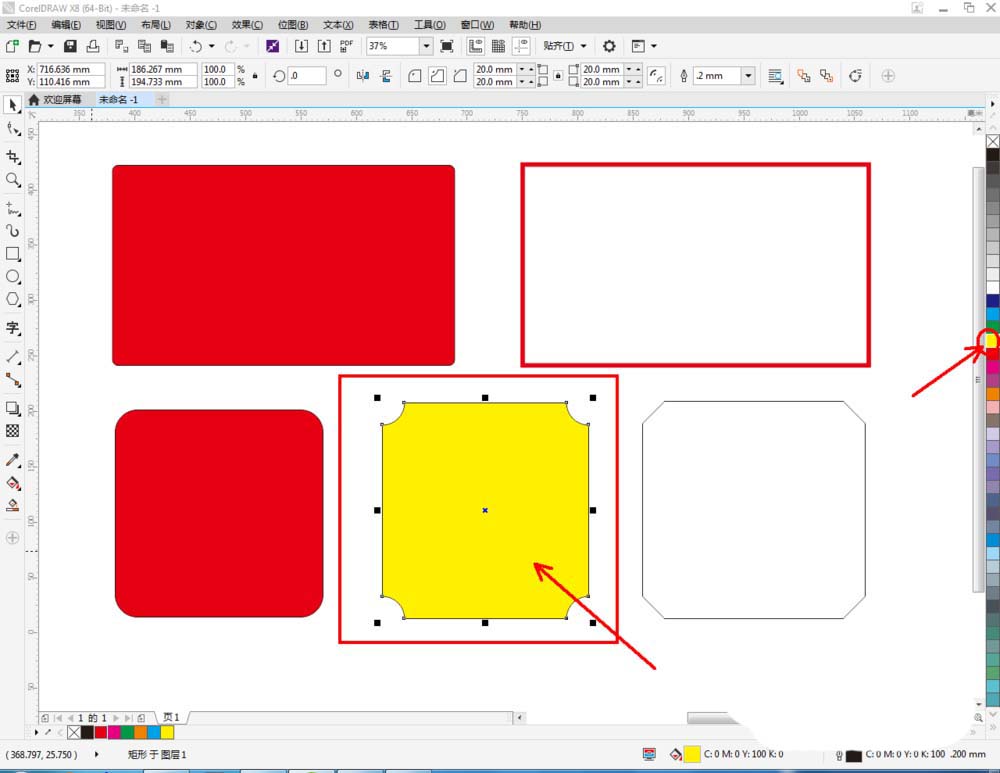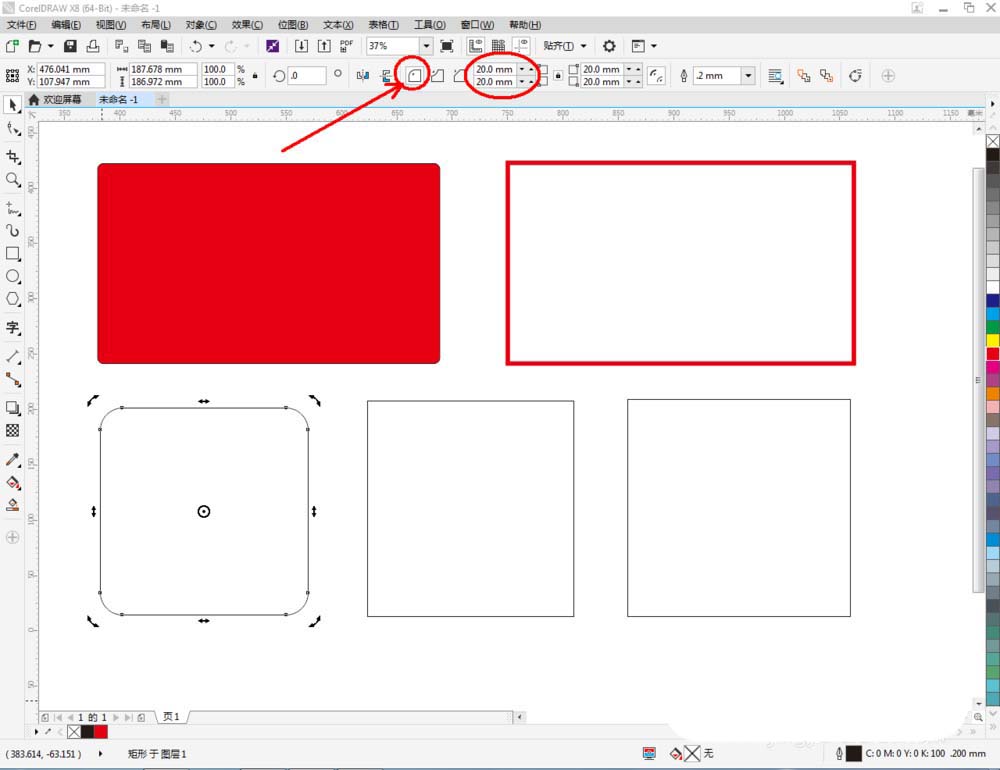 3、点击【矩形工具】,在作图区域绘制三个矩形图案。分别点击上方的【圆角】、【扇形角】、【倒角】,并分别设置好参数大小,制作出化角后的矩形图案(如图所示);