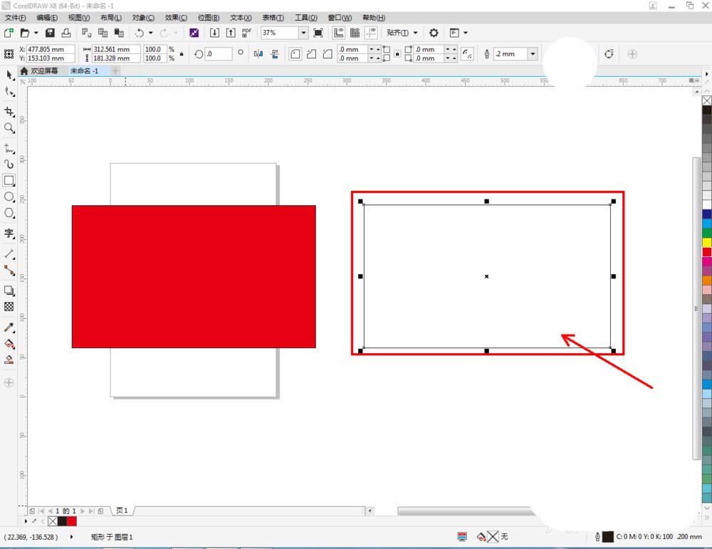 2、点击【矩形工具】,在作图区域绘制另外一个矩形图案。鼠标右键点击右边色板中的红色,可以绘制出一个红色矩形框图案。点击上方【轮廓宽度】可设置方框的宽度(如图所示);
