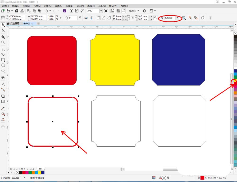 4、选中圆角矩形图案,鼠标左键点击右边色板中的红色,绘制出红色圆角矩形图案。同样的步骤,完成另外两个图案的制作(如图所示);