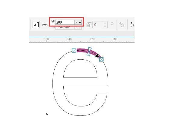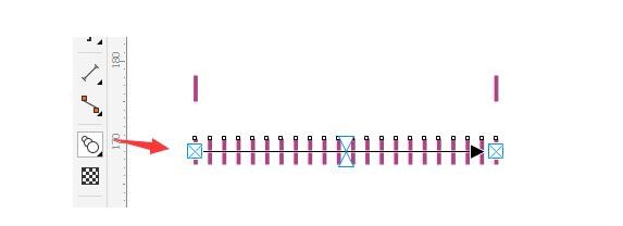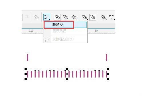 4、选择调和好的小线段,点击新建路径图标,出现黑色箭头后点击“e”字,这时,线段粘贴在路径上,然后根据需要输入短线的数量。