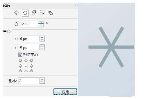 4、把中心点移至要绘制的米字架的中心位置。执行“窗口”→“泊坞窗”→“变换”→“旋转”命令,打开“变换”泊坞窗,设置角度为60度,在“副本”文本框中添加复制个数5,如图所示。