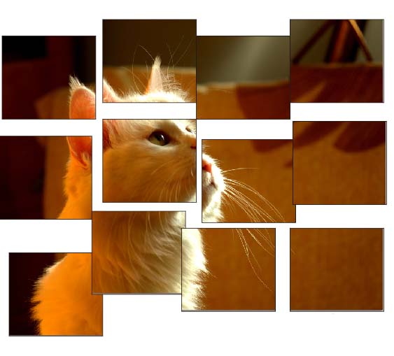 8、选中所有对象 (Ctrl+A),然后单击取消所有群组以分开“拼图”的 9 个拼图板,单击并拖动各个图像碎片,随意分开它们。