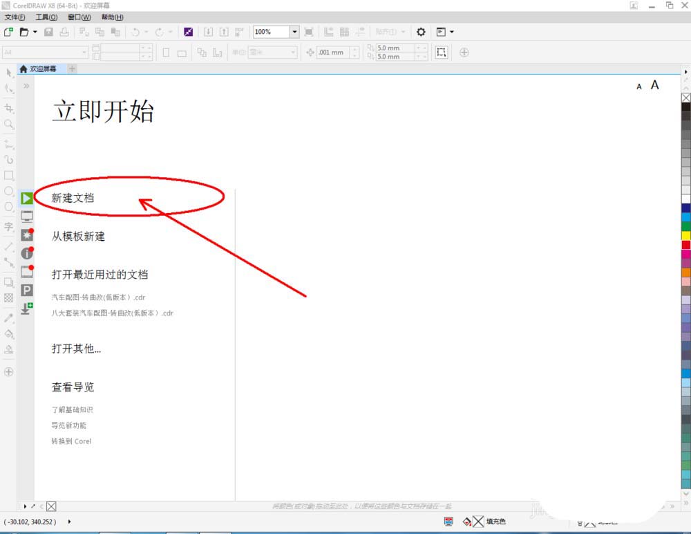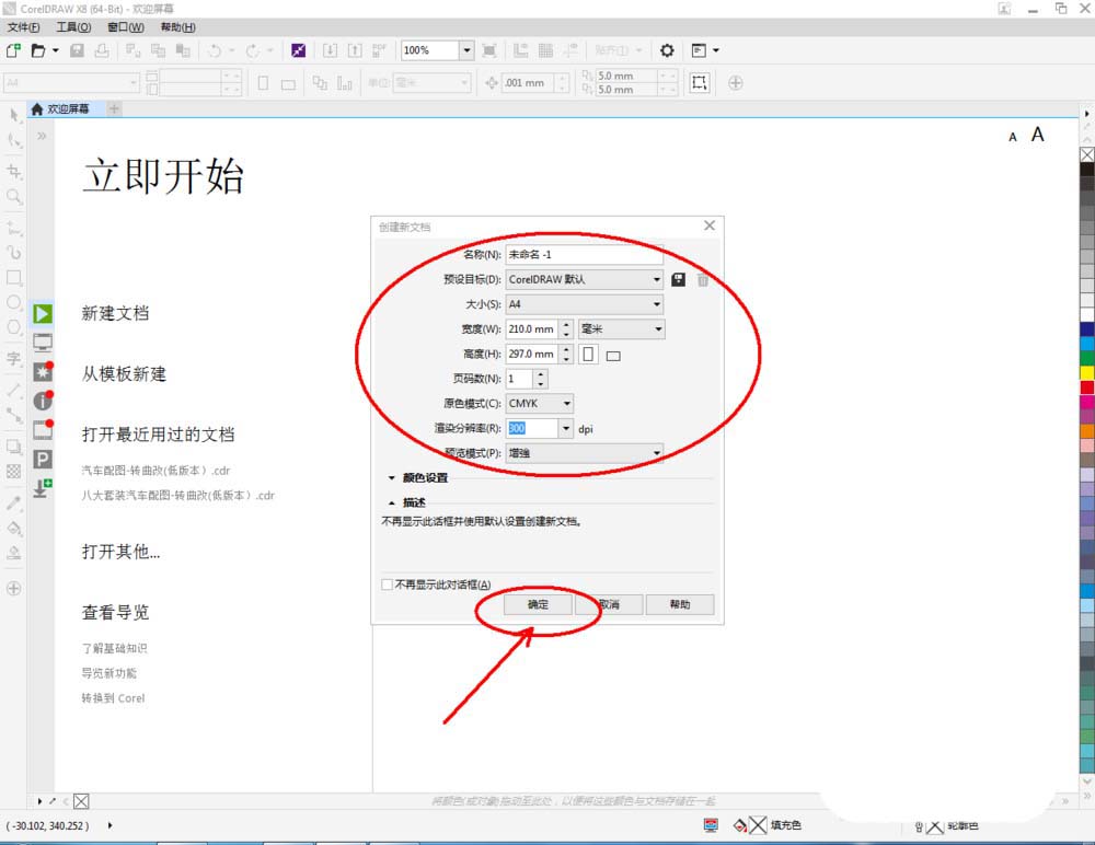 1、打开CorelDRAW X8软件,点击【新建文档】,并按图示设置好cdr文档的各个参数(如图所示);