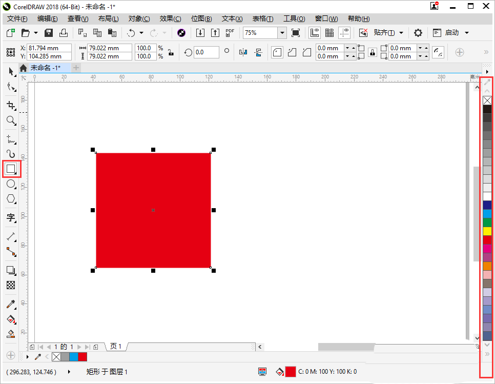 2、在左侧工具栏中选择【矩形工具】,在画布中绘制一个正方形,并用鼠标左键点击右侧的红色,这样就画出了一个红色正方形