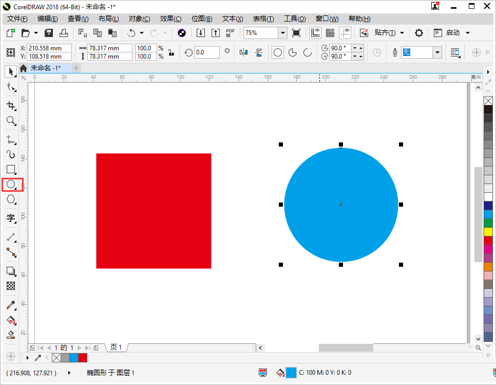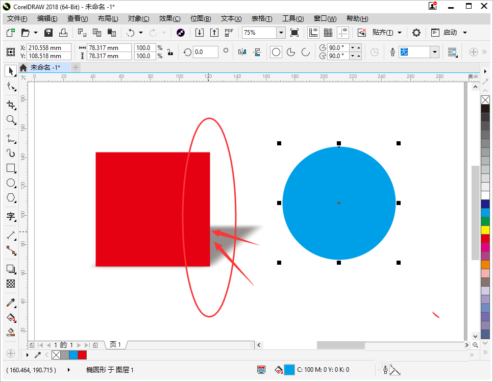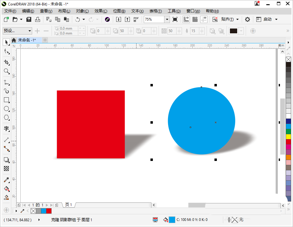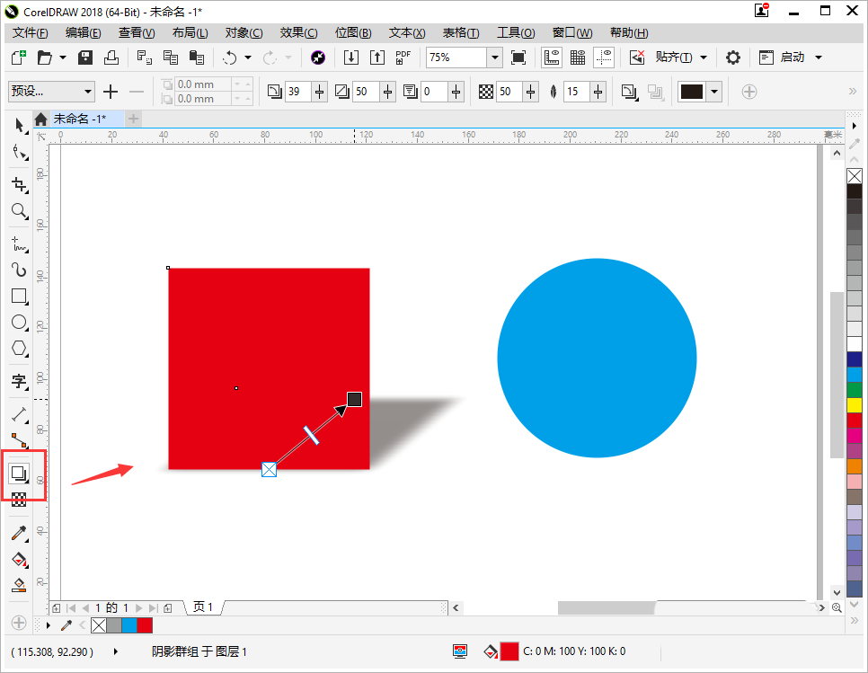4、鼠标选中左侧的方形,点击工具栏中的【投影】工具,然后在红色方形上做一个投影,那怎么把一模一样的投影宝贝到蓝色圆形上呢