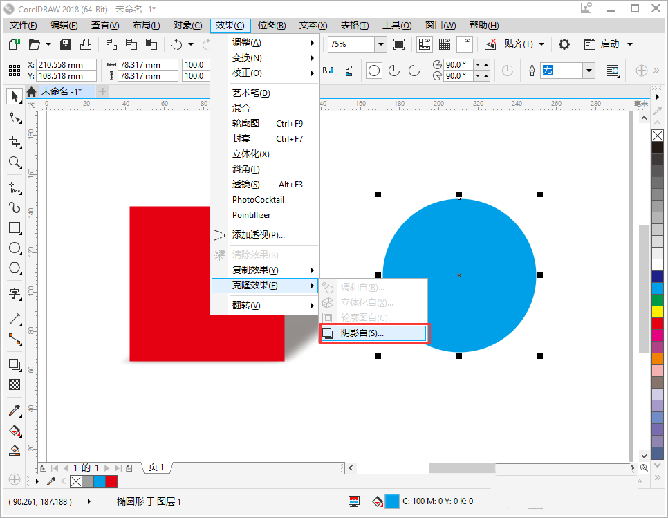 5、鼠标选中蓝色圆形,点击【效果】-【克隆效果】-【阴影】