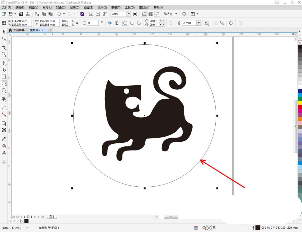 5、点击【椭圆形工具】,在作图区域绘制一个圆框。点击【轮廓图】对圆形图案进行轮廓后,点击鼠标右键-【拆分轮廓图群组】,将两个图案拆分并分别设置好圆框的轮廓宽度。这样我们整个生肖虎图标便全部制作完成。
