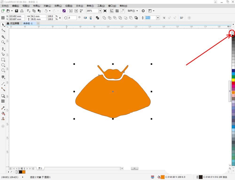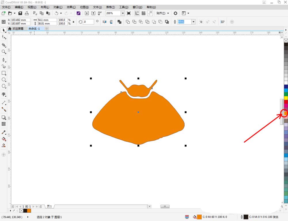 3、点击【选择工具】,选中整个身体部分图案,鼠标左键点击右边色板中的橘色色块,将其填充为橘色。点击【钢笔工具】绘制出巨蟹座符号后,鼠标左键点击色板中的白色,将符号填充为白色。最后,选中整个图案,鼠标右键点击色板中的×,去除图案描边(如图所示);