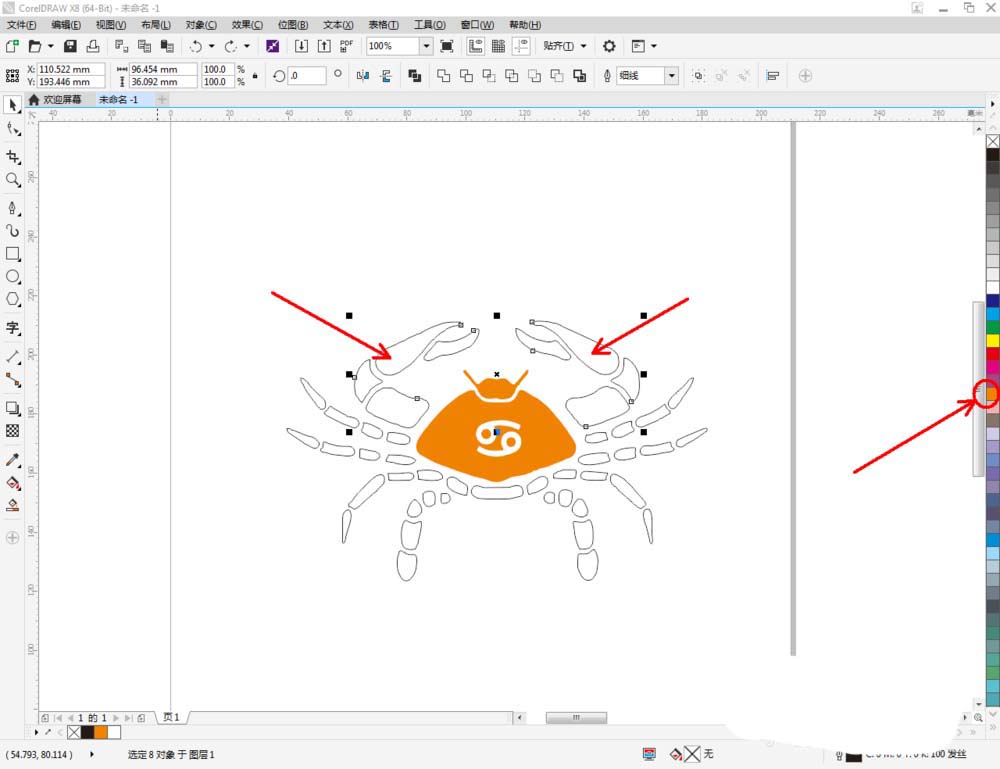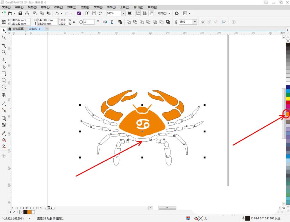 5、最后,选中所有足部图案,鼠标左键点击右边色板中的橘色,将图案填充为橘色。完成后,选中所有图案,鼠标右键点击色板中的×,去除图案所有描边,这样我们的巨蟹座图标便全部制作完成。