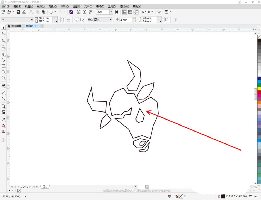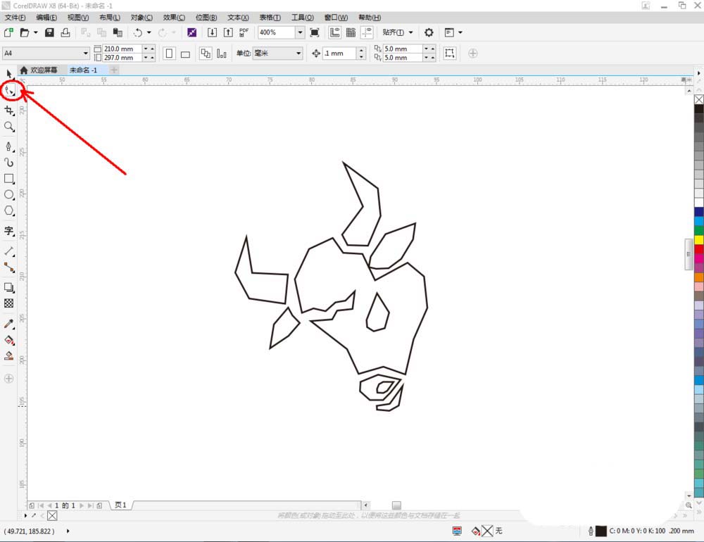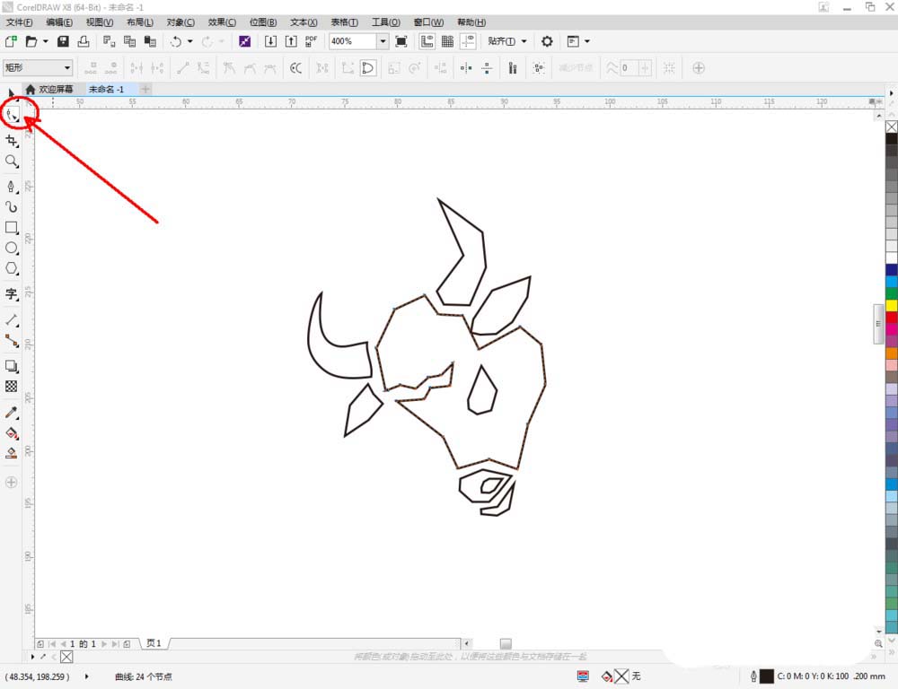 3、完成牛角图案的绘制后,点击【形状工具】,选中头部图案上的所有点,同样点击【转换为曲线】将图案转曲后,按图示调整控制点,完成整个头部图案的绘制(如图所示);
