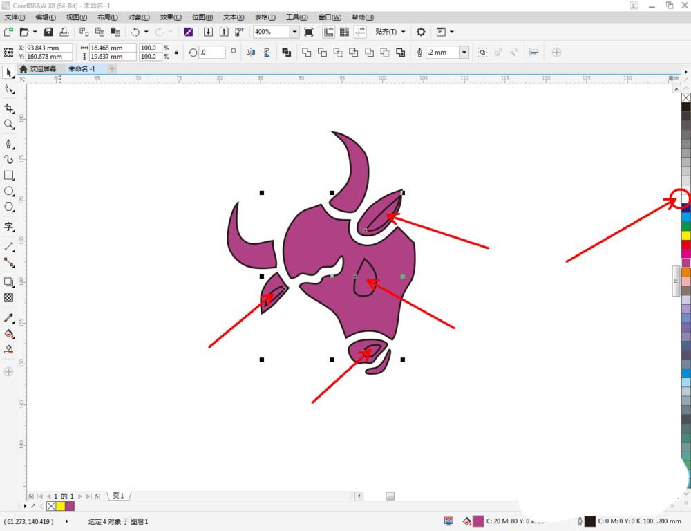 4、点击【选择工具】,选中整个头部图案,鼠标左键点击右边色板中的紫色色块,将其填充为紫色。选中耳朵、眼睛、鼻子部分,鼠标左键点击色板中的白色,将其填充为白色。最后,选中整个图案,鼠标右键点击色板中的×,去除图案描边(如图所示);