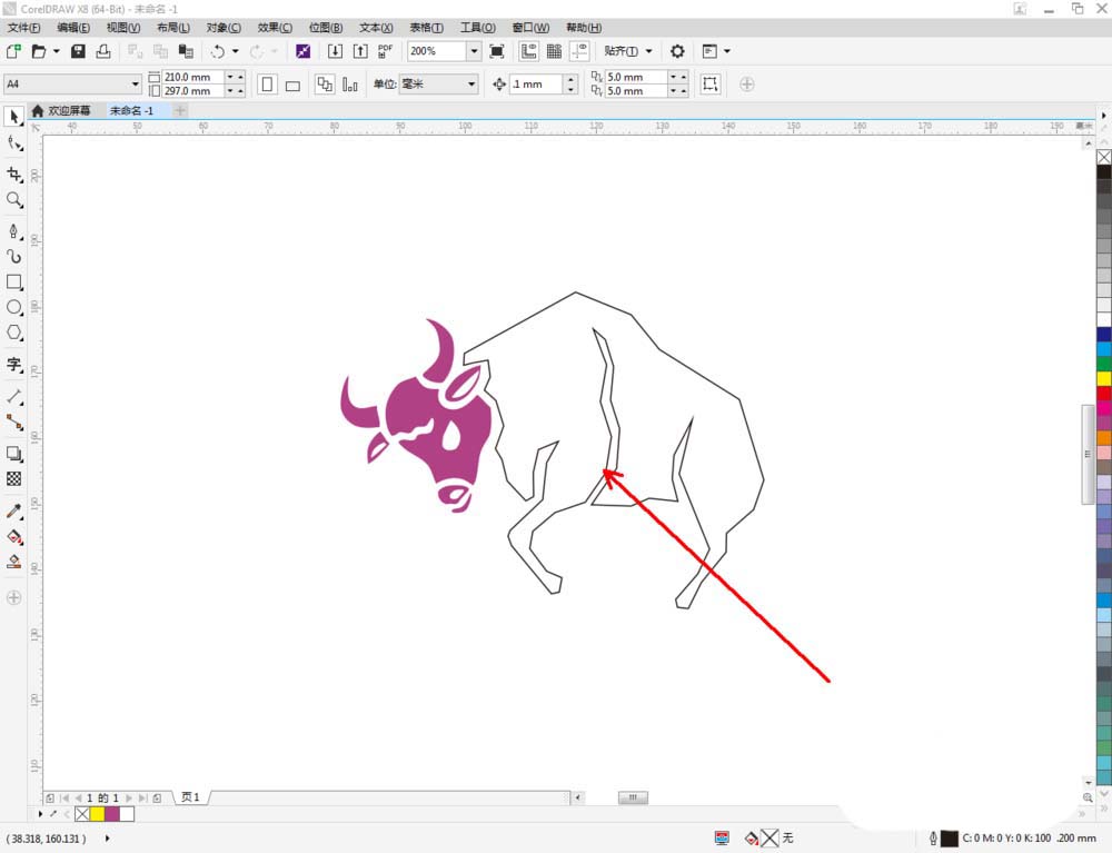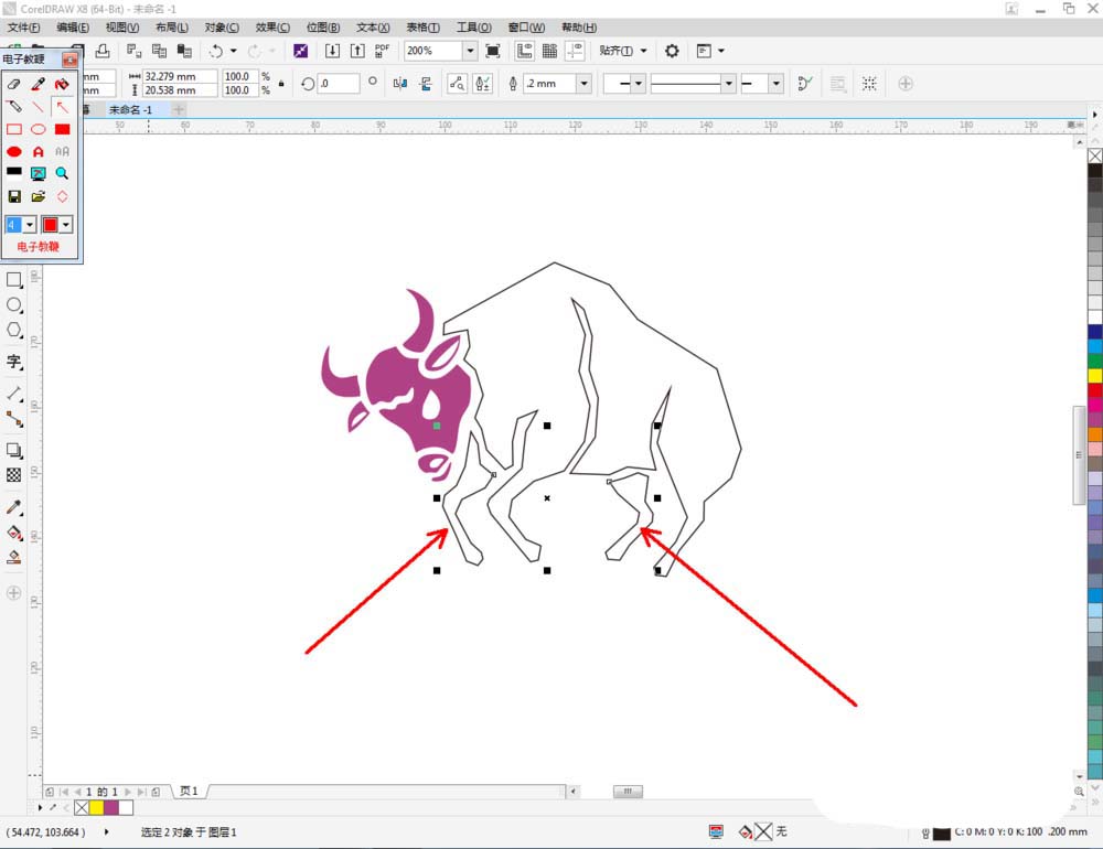 5、接着,完成金牛座身体部分图案的绘制。点击【钢笔工具】,在作图区域使用钢笔线段绘制出身体部分图案的轮廓。选中图案上的点,点击【转换为曲线】,将整个图案转曲后,对控制点进行调整,绘制出身体部分并填充颜色,完成整个金牛座图案的制作。