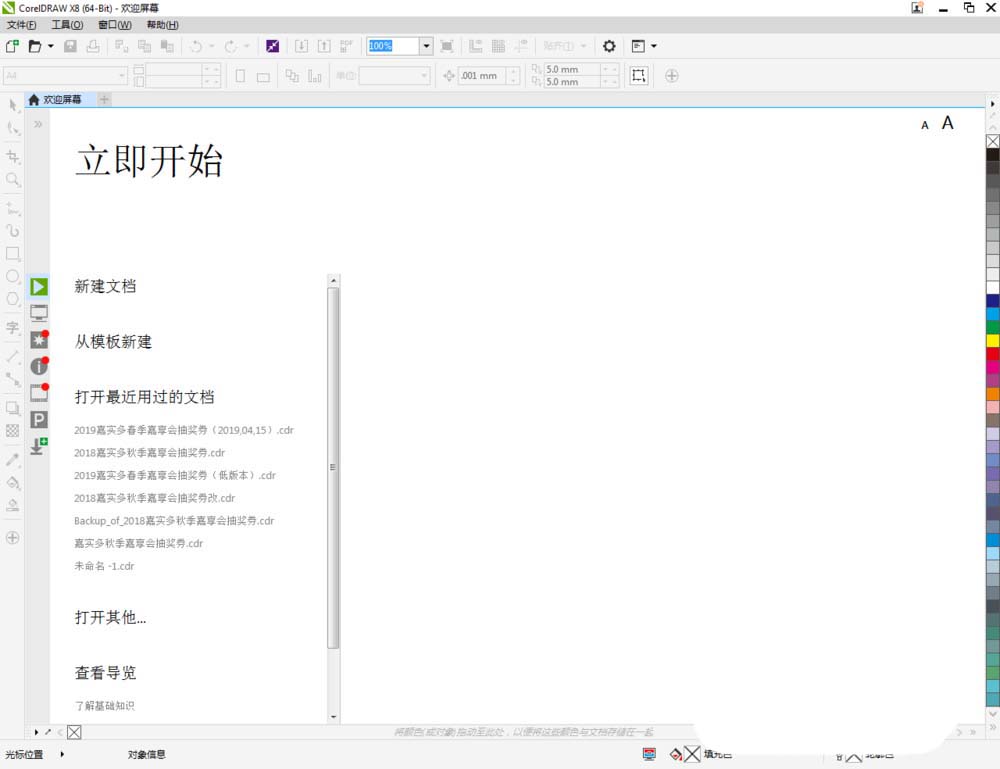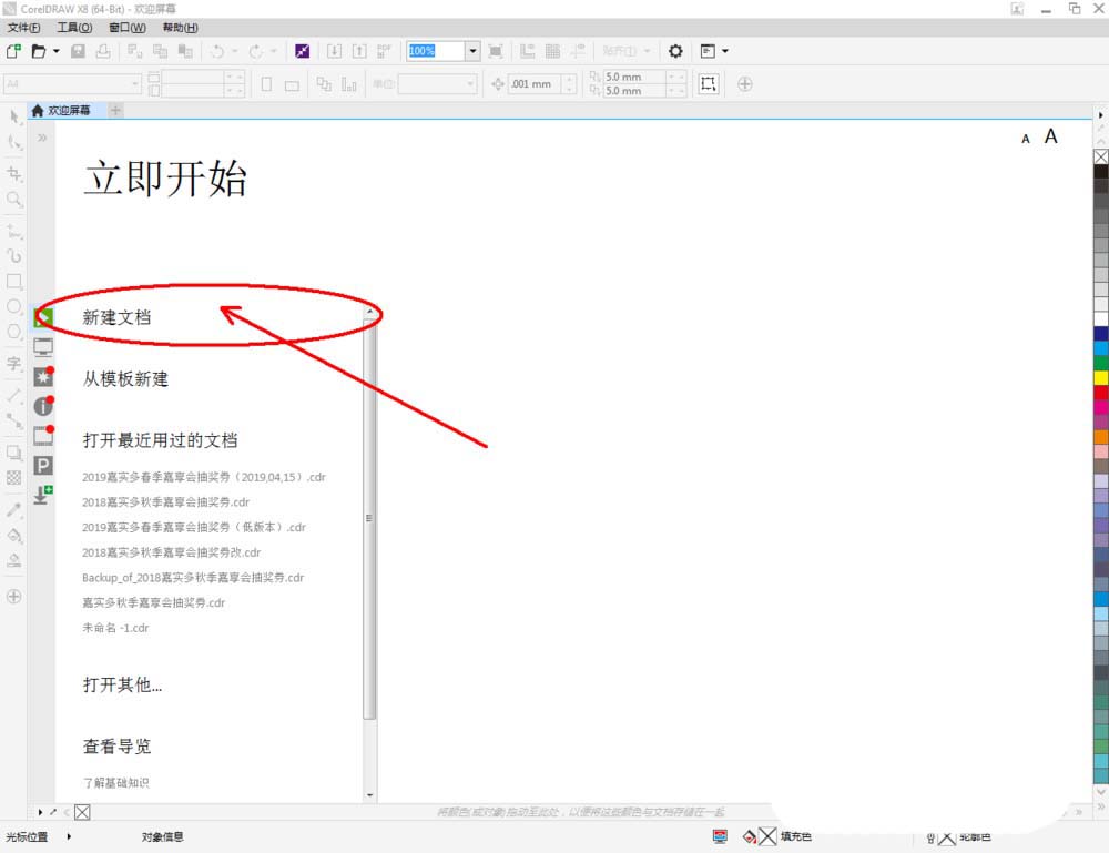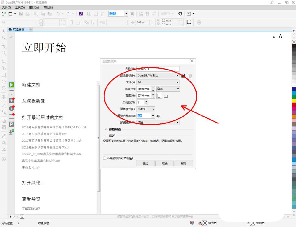 1、打开CorelDRAW X8软件,点击【新建文档】,按图示参数新建一个cdr文档(如图所示);