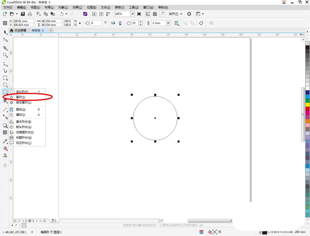 2、点击【椭圆形工具】,在作图区域绘制一个圆形图案。;点击【星形工具】在圆形图案的左上方绘制一个星形图案。完成后,调整好两个图案的位置(如图所示);