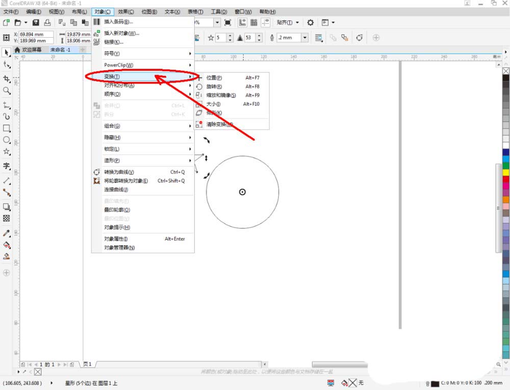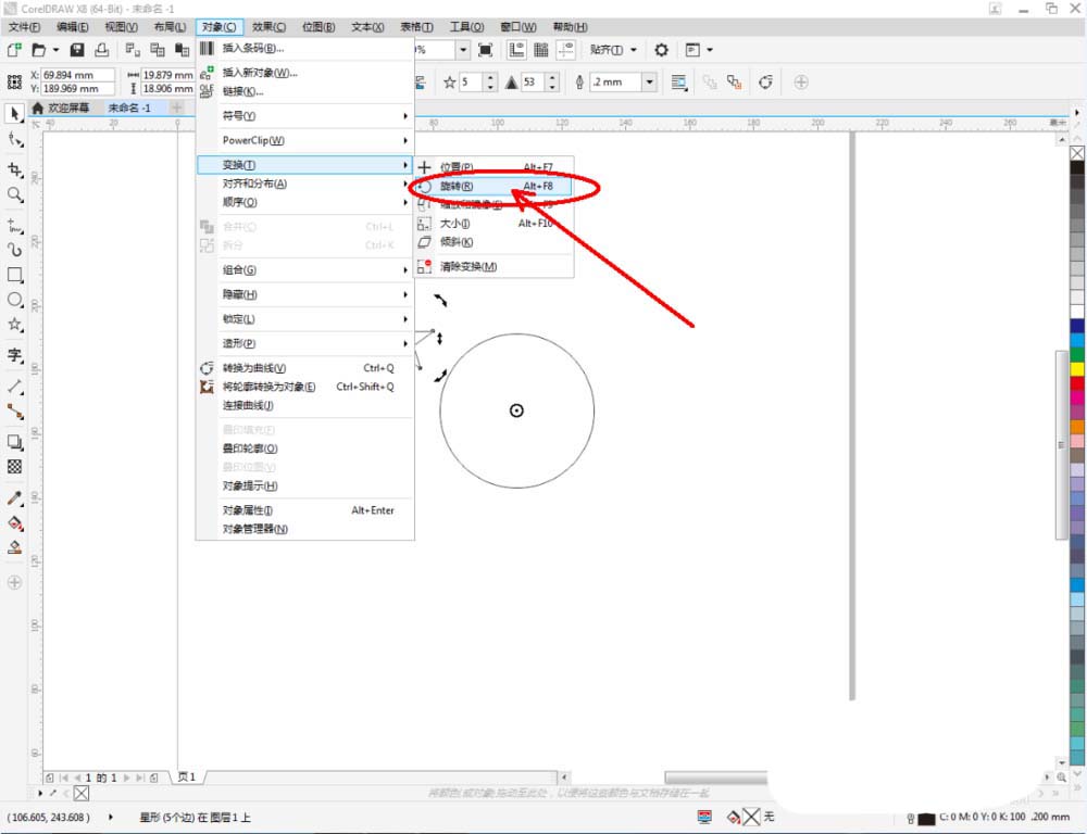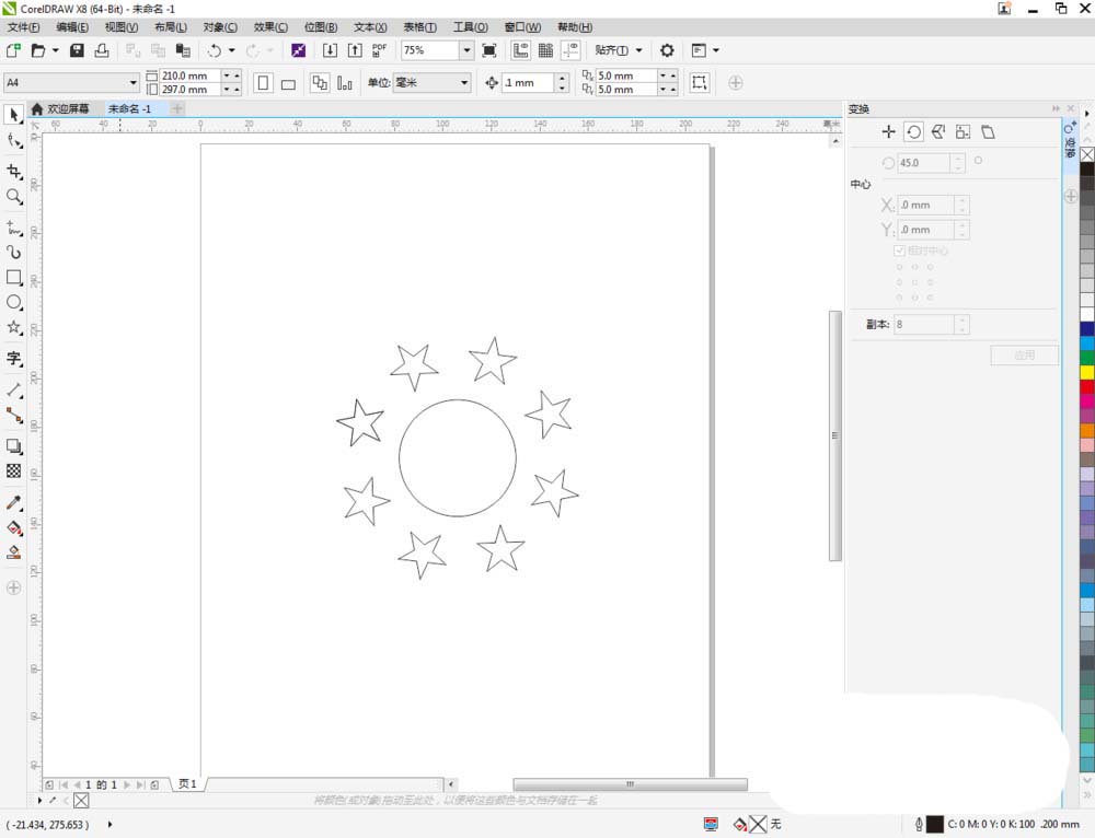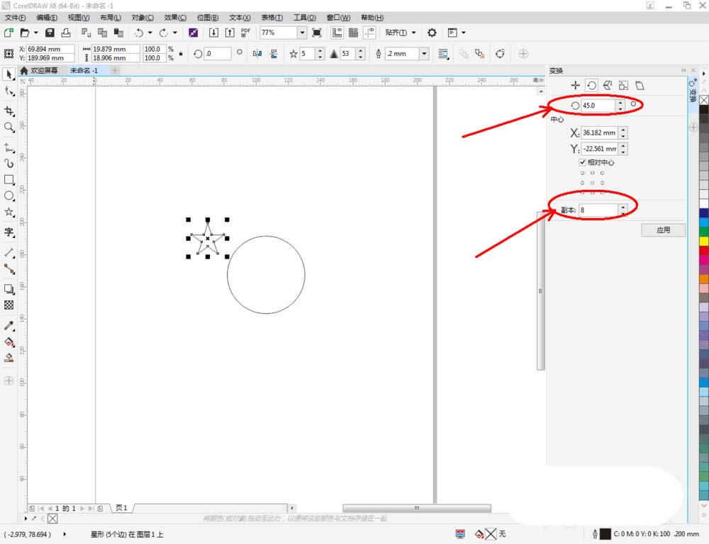 4、鼠标双击星形图案,将星形图案中心的小圆圈移动到圆形图案的中心点位置。将右边变换窗口中的旋转角度设置为:45;副本数量设置为:8,完成对星形图案的阵列(如图所示);