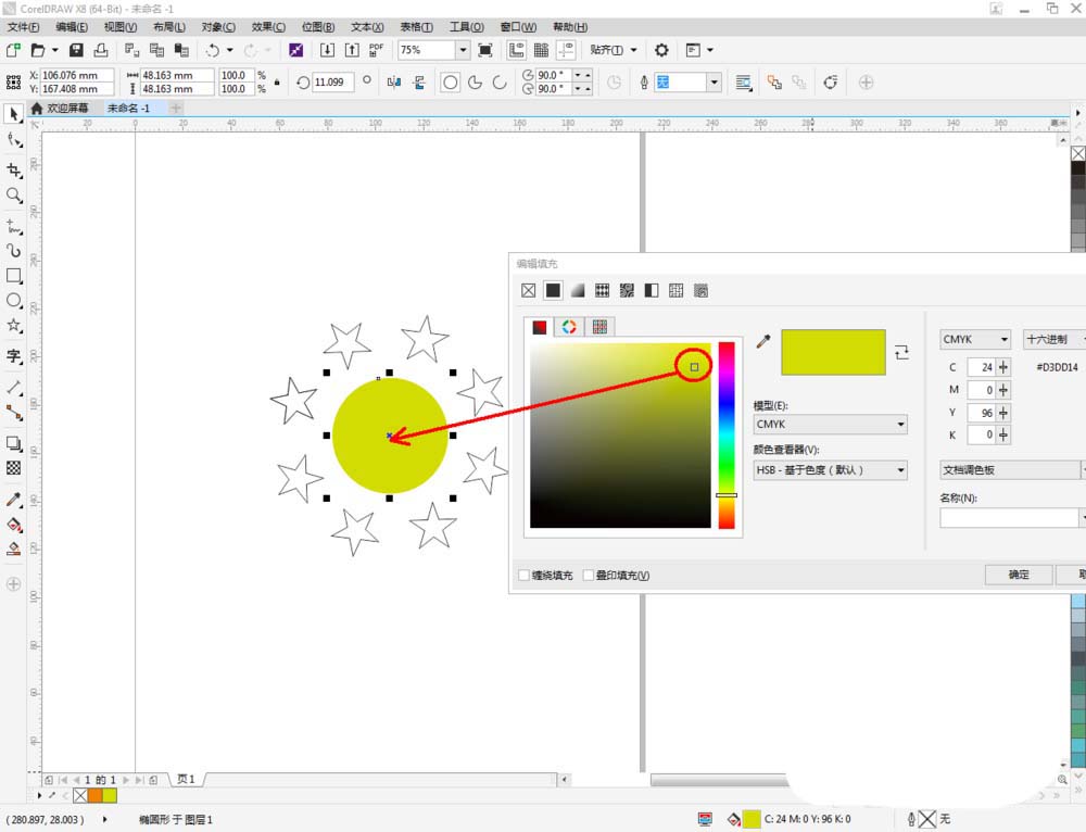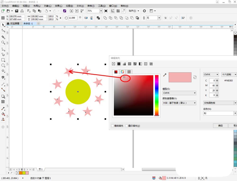 5、完成星形图案的阵列操作后,给星形图案和圆形图案填充颜色并完善细节部分的制作。这样我们通过阵列绘制出来的作品边全部制作完成。