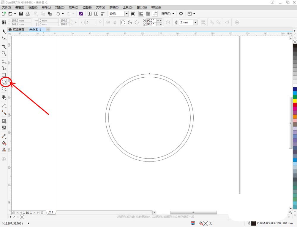 2、点击【椭圆形工具】在作图区域绘制一个圆形图案。点击【轮廓图】拉动圆形图案进行轮廓处理后,点击鼠标右键-【拆分轮廓图群组】将图案拆分(如图所示);