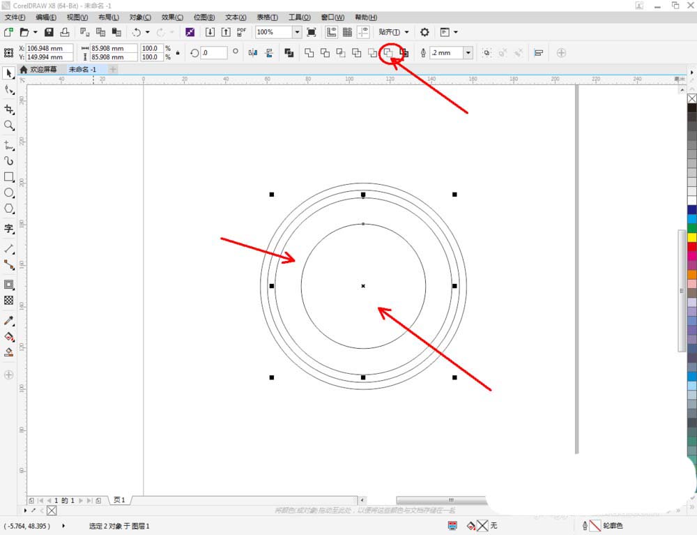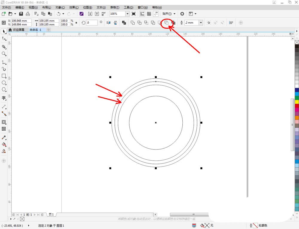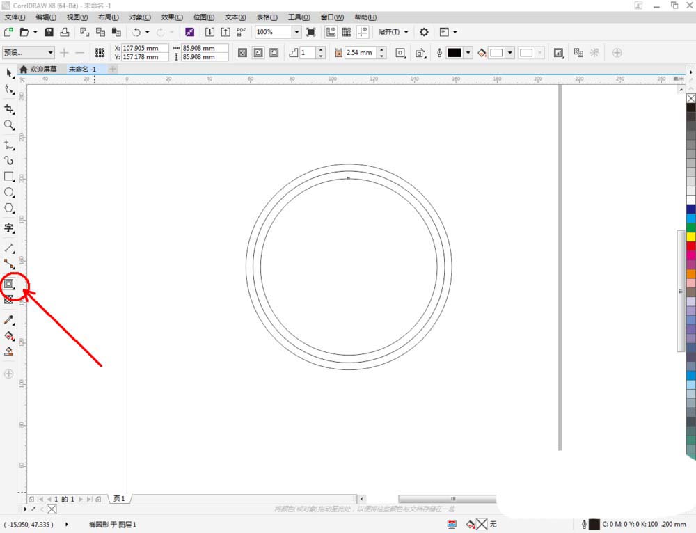 3、点击【椭圆形工具】在作图区域绘制另外一个圆形图案。点击【轮廓图】拉动圆形图案进行轮廓处理后,点击鼠标右键-【拆分轮廓图群组】将图案拆分(如图所示);