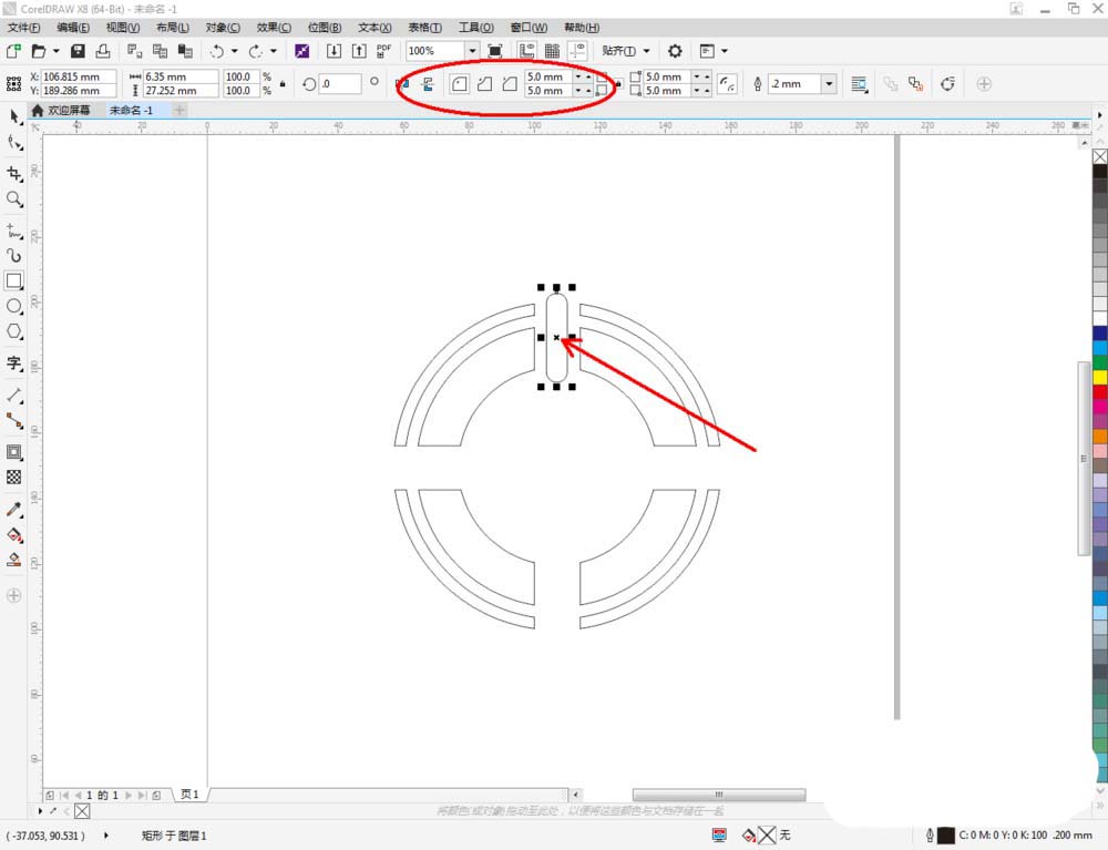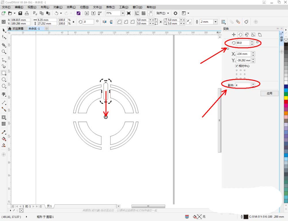 6、点击【矩形工具】按图示参数绘制一个圆角矩形图案。点出变形设置框,按图示设置好各个参数后,完成圆角矩形图案的环形阵列操作。点击【选择工具】框线所有图案后,点击【合并】将图案合并为一体并将其填充为黑色,这样我们的瞄准图标便全部制作完成了。