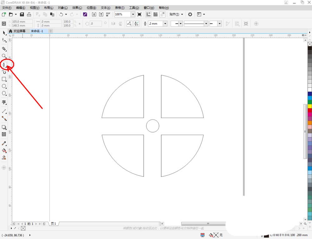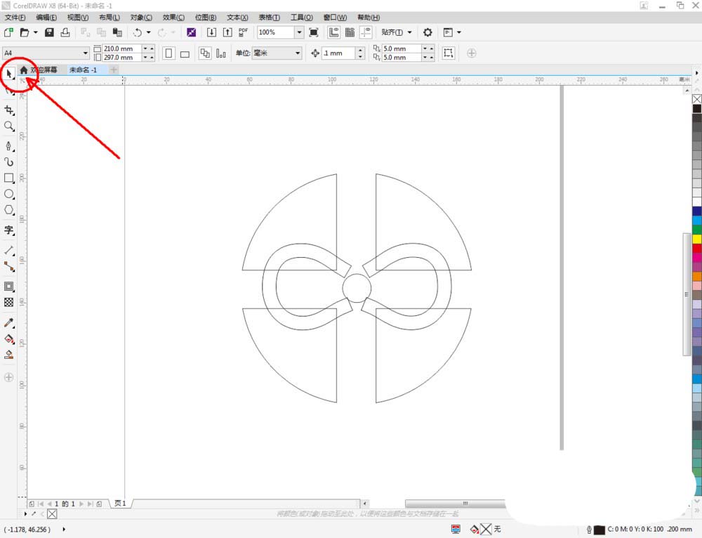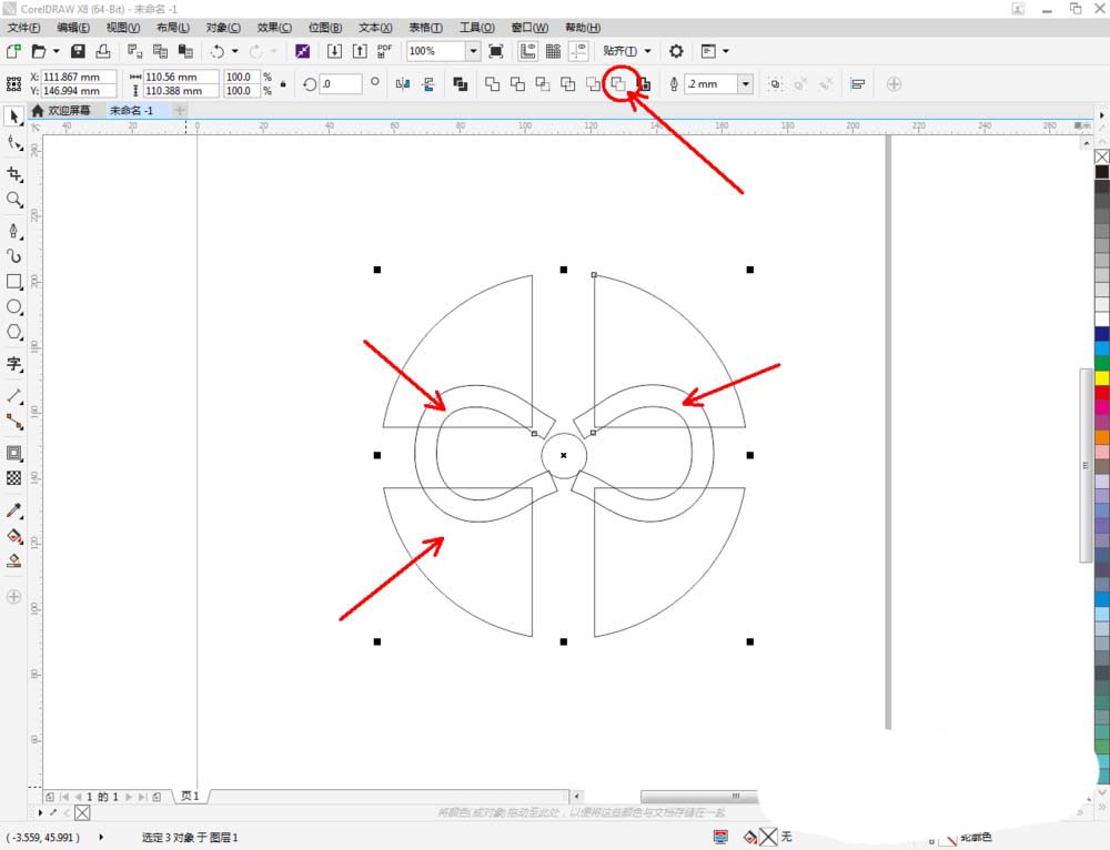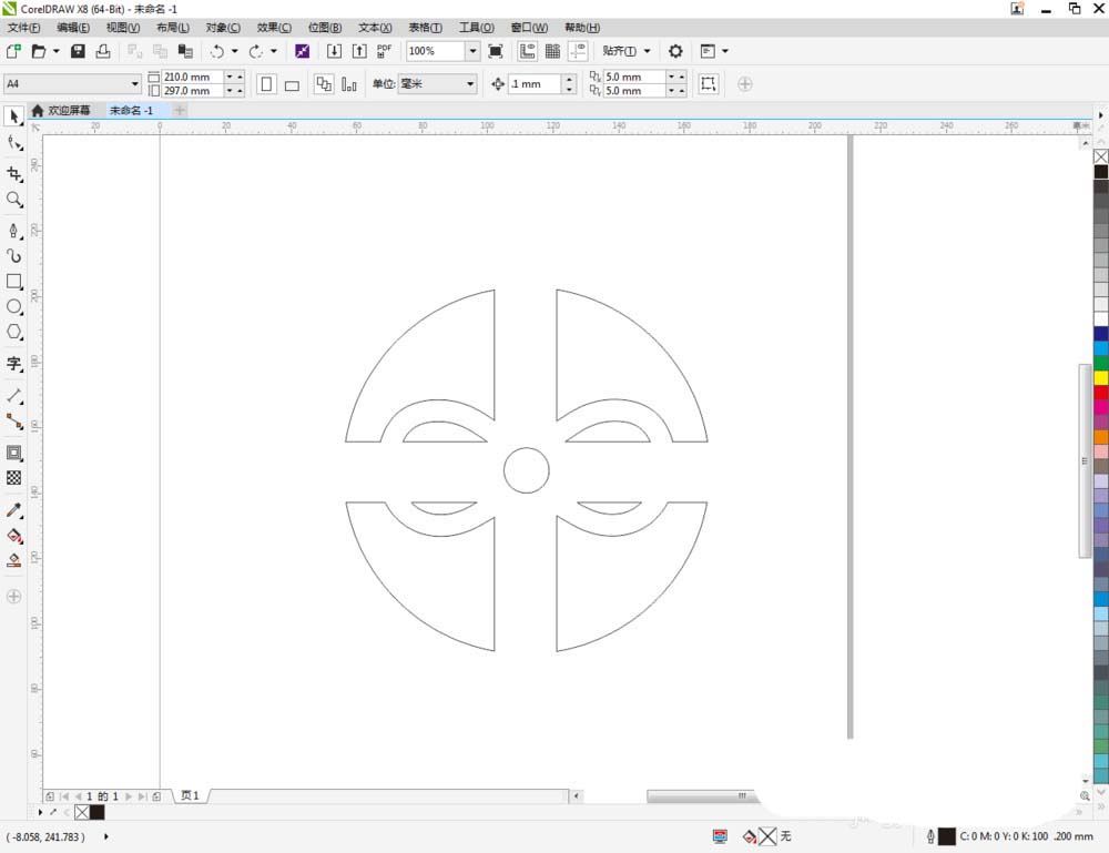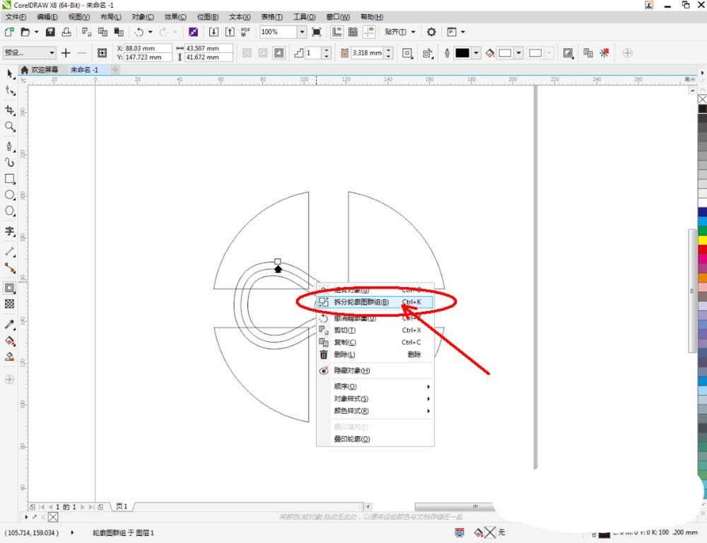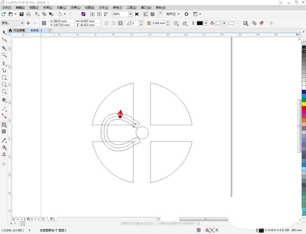 5、点击【轮廓图】对做好的线段图案进行轮廓处理。完成后,点击鼠标右键-【拆分轮廓图群组】并将线段图案删除。选中图示图案,将图案进行拉动复制和镜像操作,调整好各图案间的位置关系(如图所示);