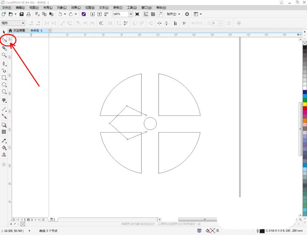 4、点击【钢笔工具】,按图示绘制一条线段图案。点击【形状工具】,框选所有的节点后,点击【转化为曲线】将节点转曲。完成后,选中图示图案上的节点,点击【平滑节点】将节点进行平滑处理并调整好控制点(如图所示);