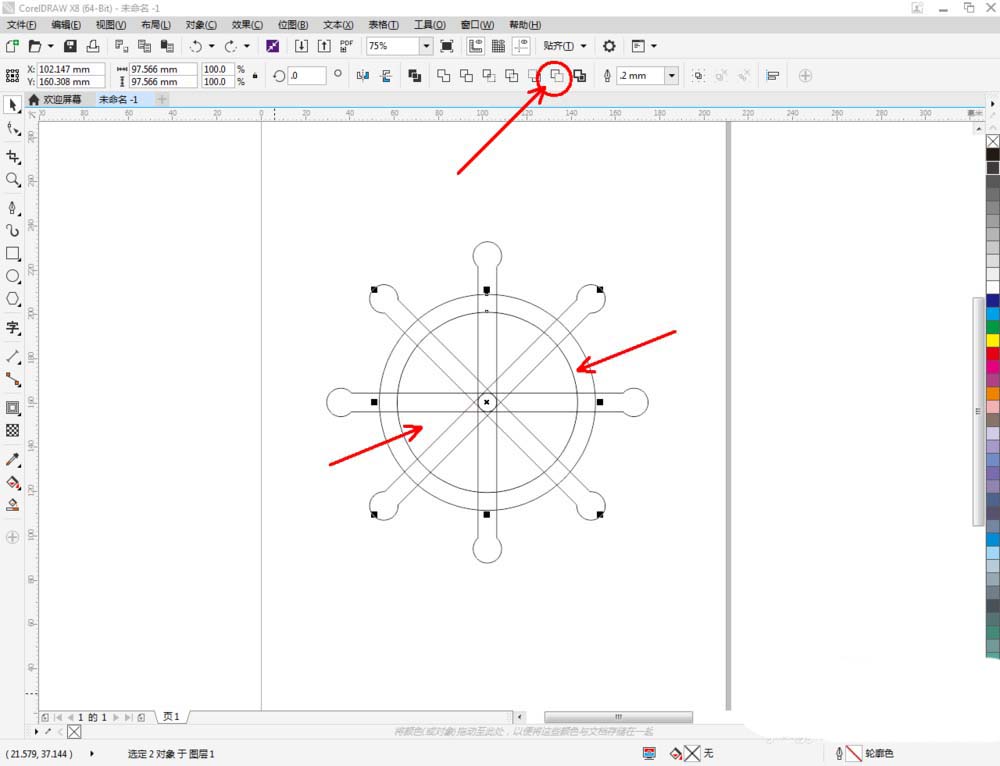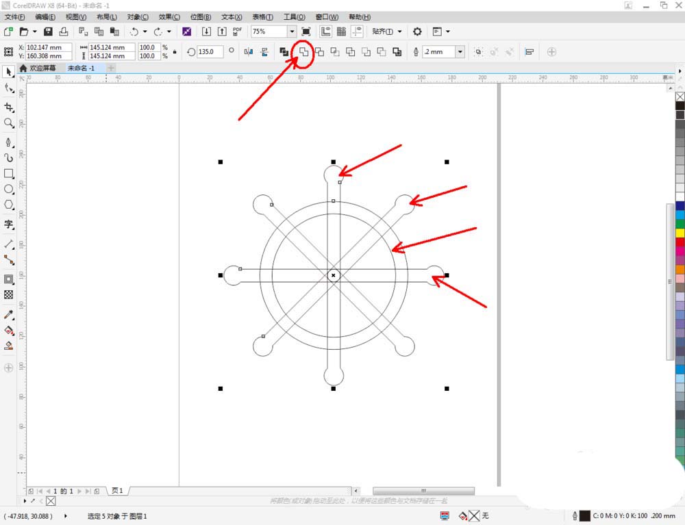 5、点击【选择工具】,选中图示两个圆形图案后,点击【移除前面对象】将前面的圆形图案部分移除。完成后,选中支杆和圆环图案,点击【合并】将其合并为一体。最后,选中所有图案,点击【移除前面对象】将小圆部分移除并将整个图案填充为黑色,这样我们的船舵图案便全部制作完成了。