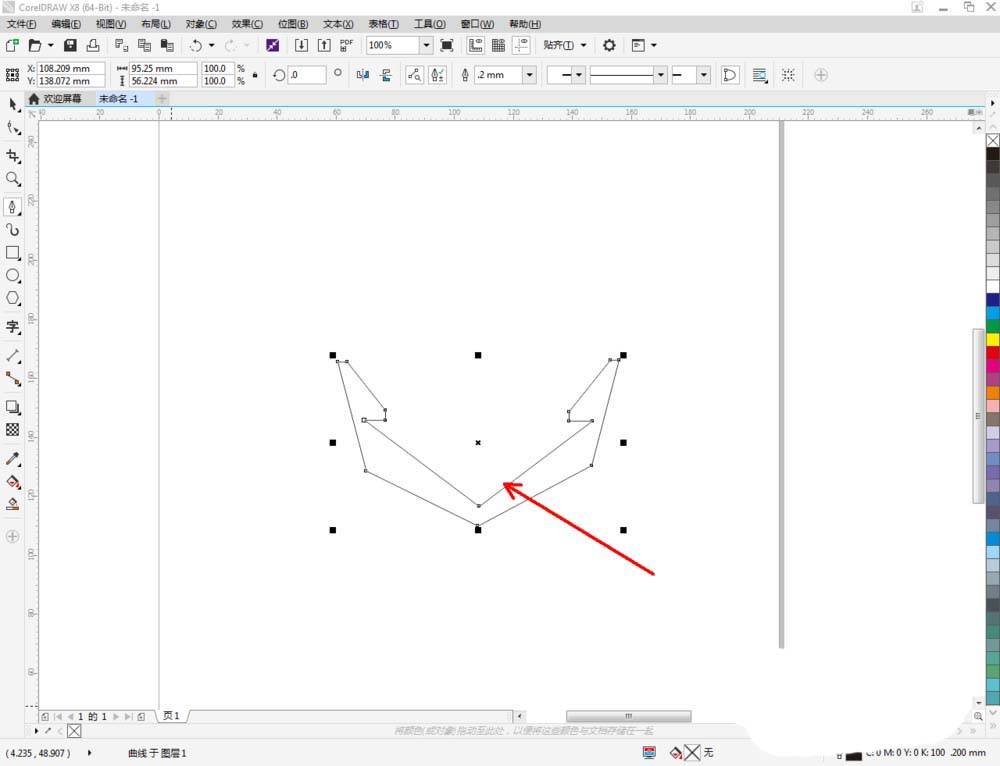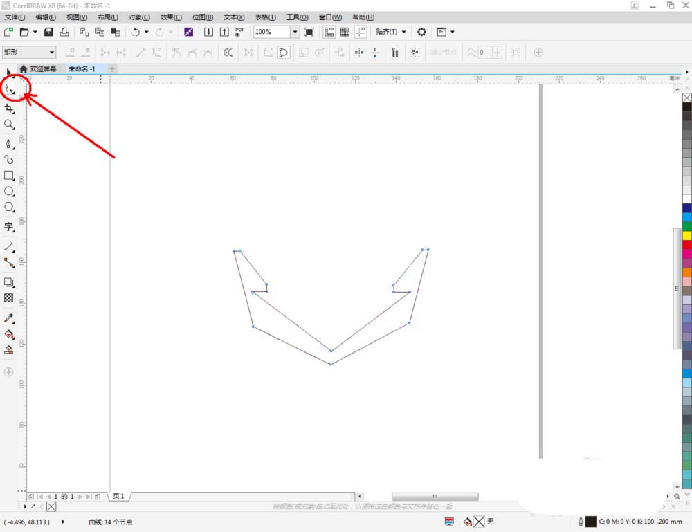 2、点击【钢笔工具】,按图示绘制出一个多边图案。点击【形状工具】选中图案上的所有点,点击【转化为曲线】后,选中图示图案上的节点,点击【平滑节点】将节点进行平滑处理并调整好控制点(如图所示);