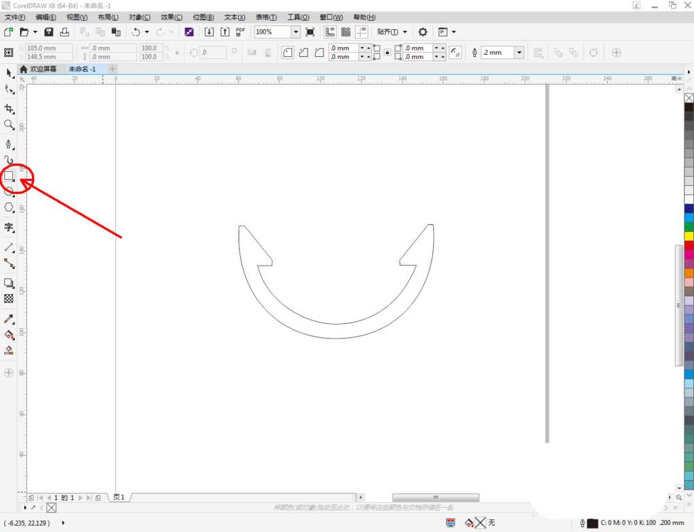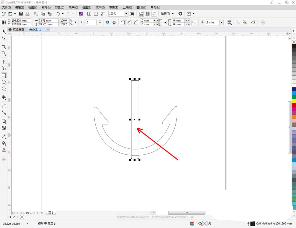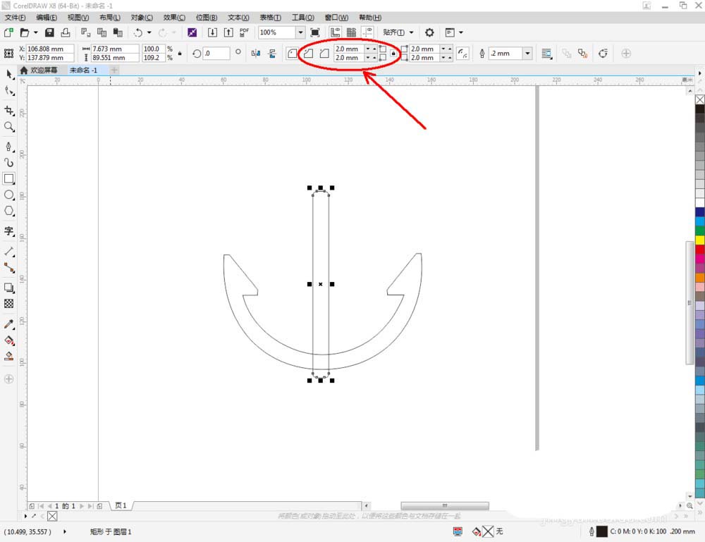 3、点击【矩形工具】,按图示在作图区域绘制一个竖向矩形图案,点击【圆角】图标并设置好圆角参数。完成后,绘制一个横向直角矩形图案,调整好图像间的位置关系(如图所示);