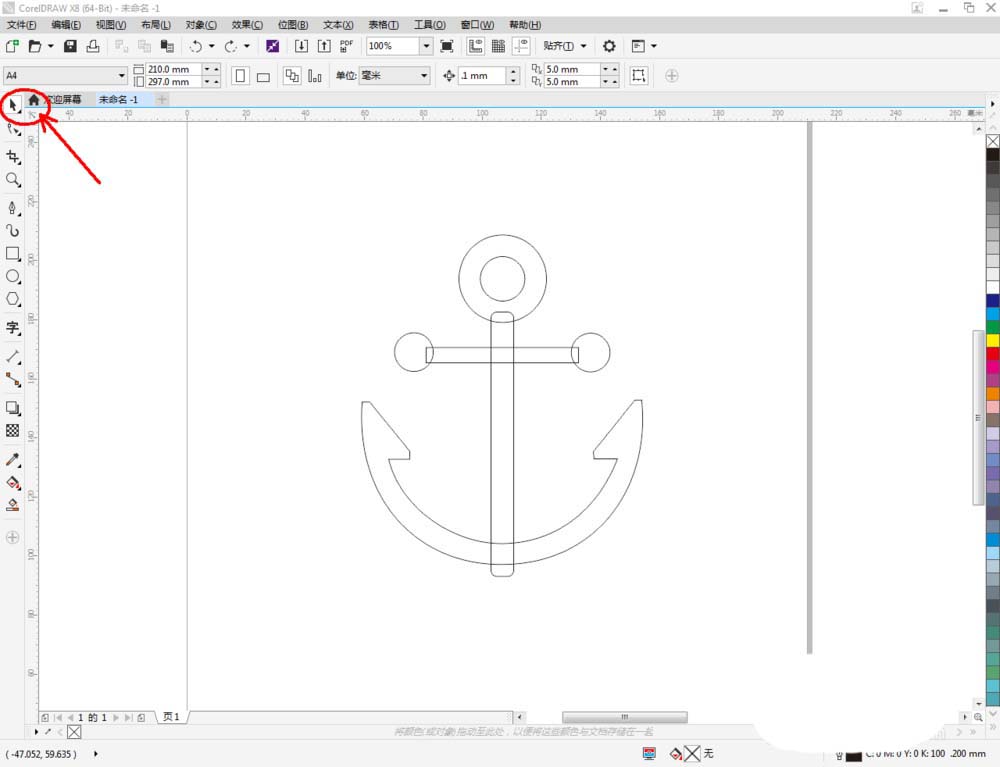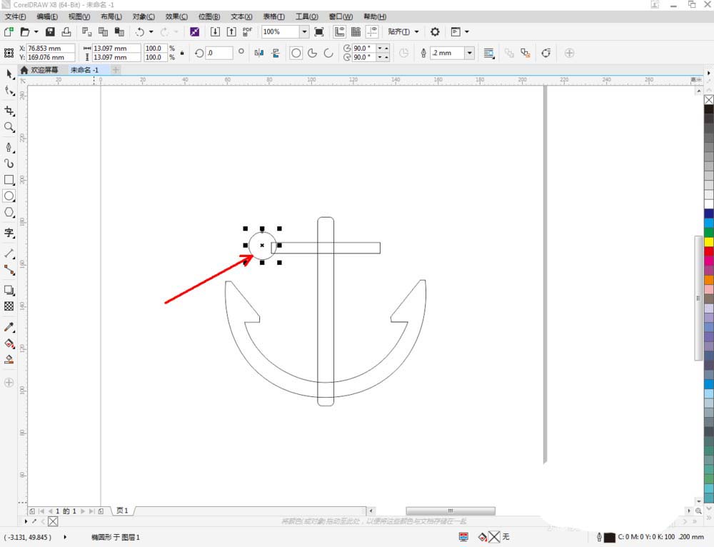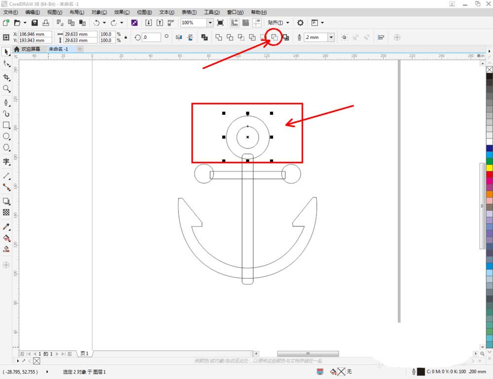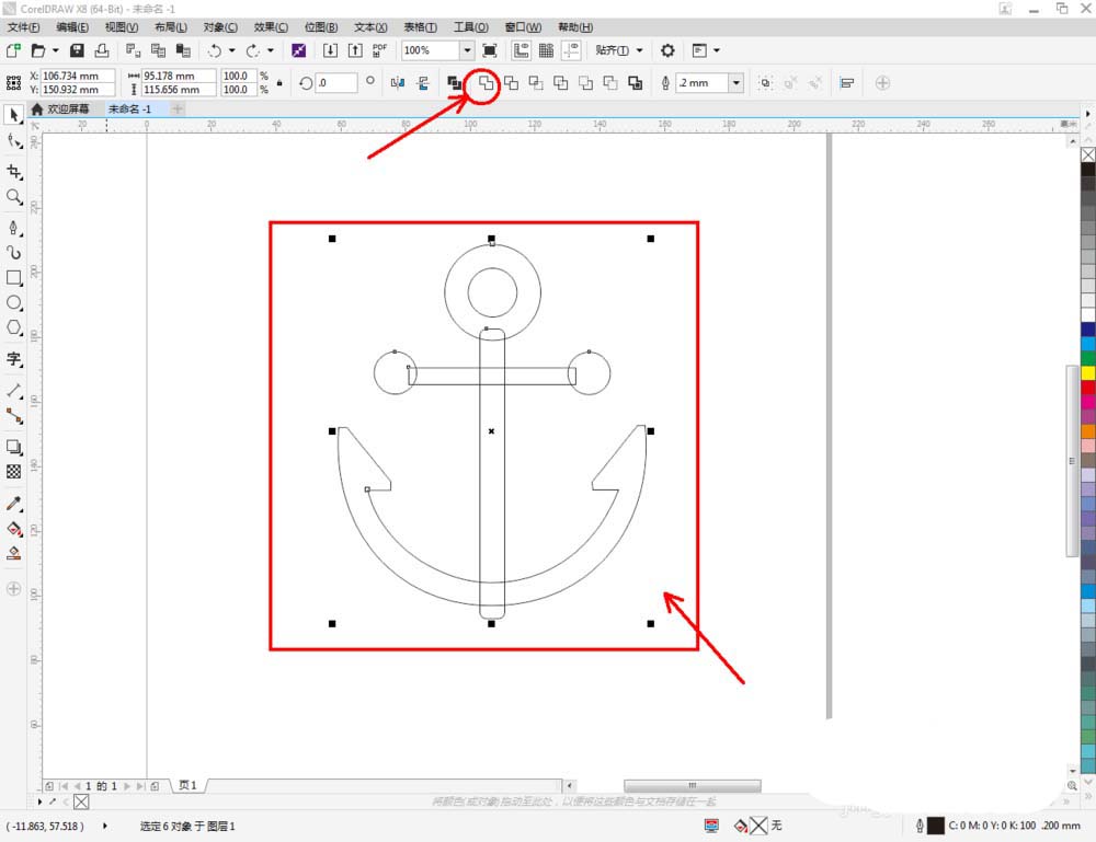 5、点击【选择工具】,选中图示两圆形图案后,点击【移除前面对象】将前面的圆形区域移除。选中所有图案,点击【合并】将所有图案合并为一体后,鼠标左键点击右边色板中的黑色色块,将船锚图案填充为黑色,这样我们的船锚图标就制作完成了。