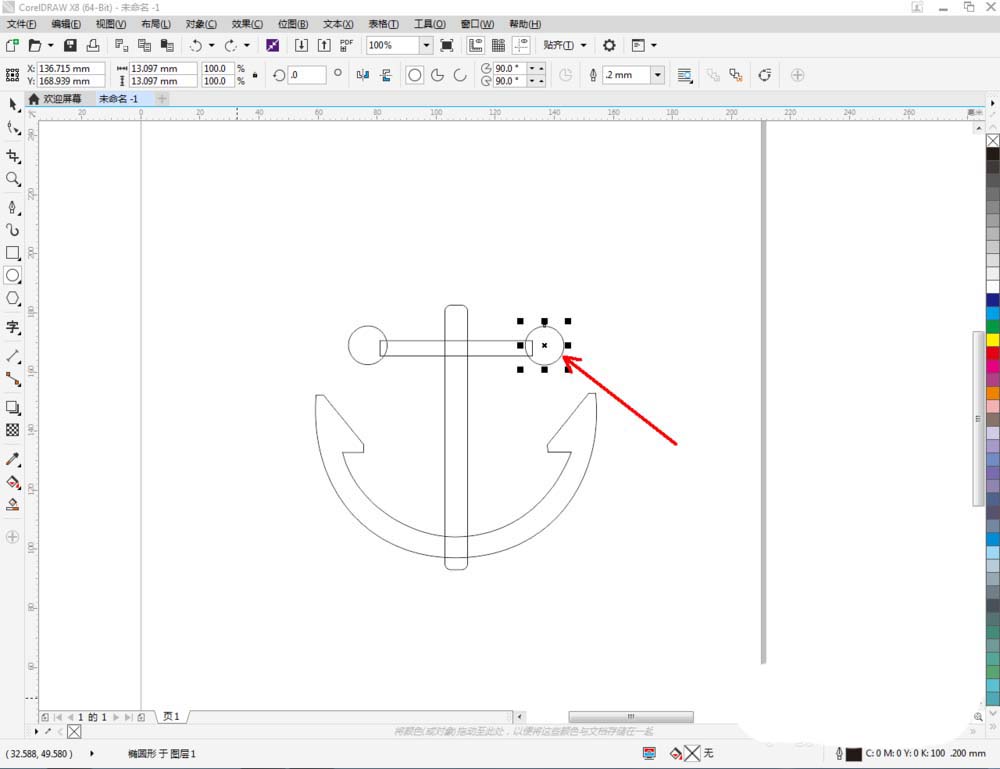 4、点击【椭圆形工具】,按图示绘制出四个圆形图案并调整好各圆形图案的位置。调整好所有图案间的位置关系,组合成船锚图标(如图所示);