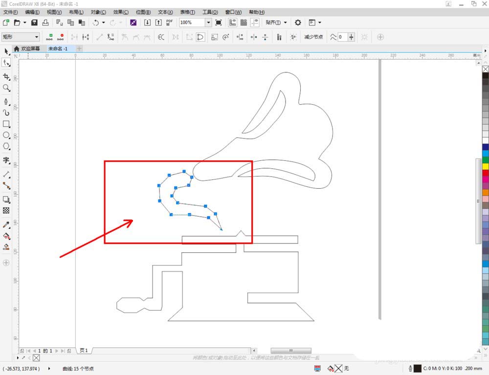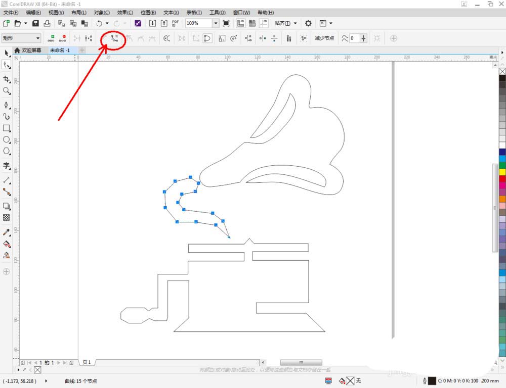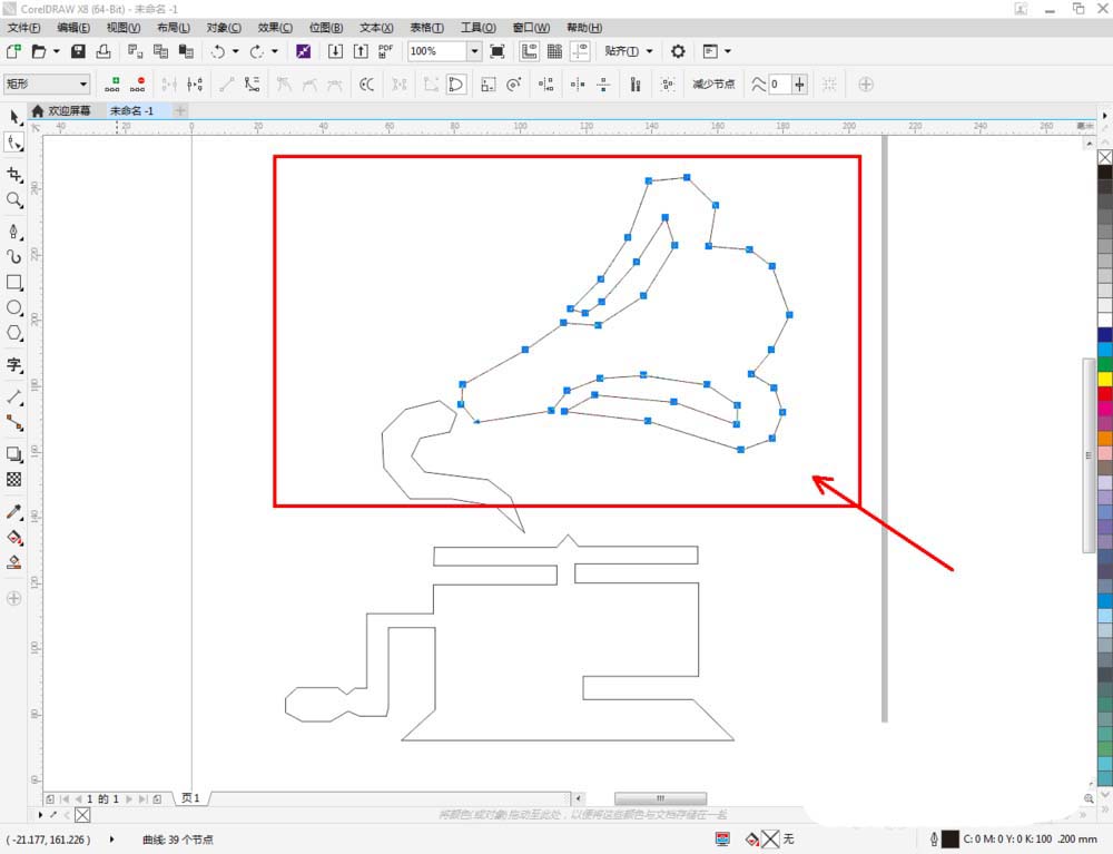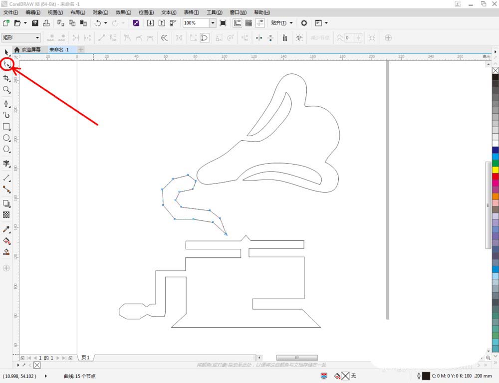 3、选中多边图案,点击【形状工具】,选中喇叭口图案上的所有点,点击【转换为曲线】将图案转曲后,按图示调整控制点,完成喇叭口图案的绘制(如图所示);