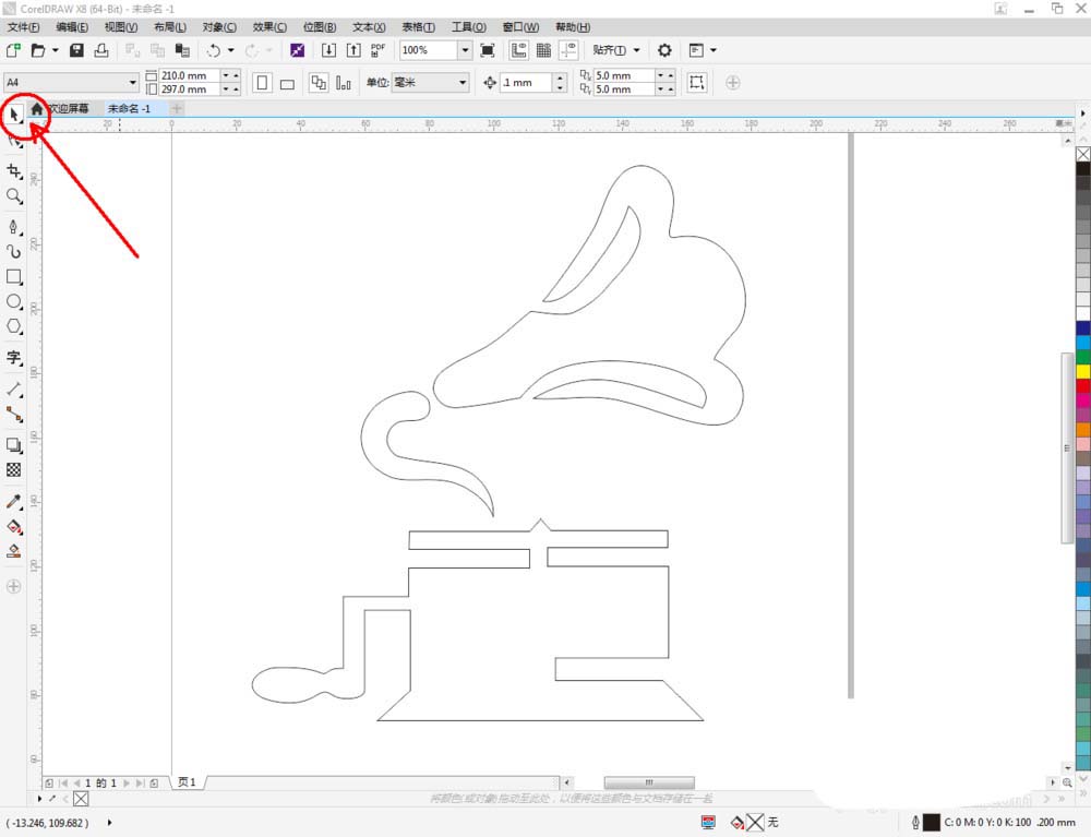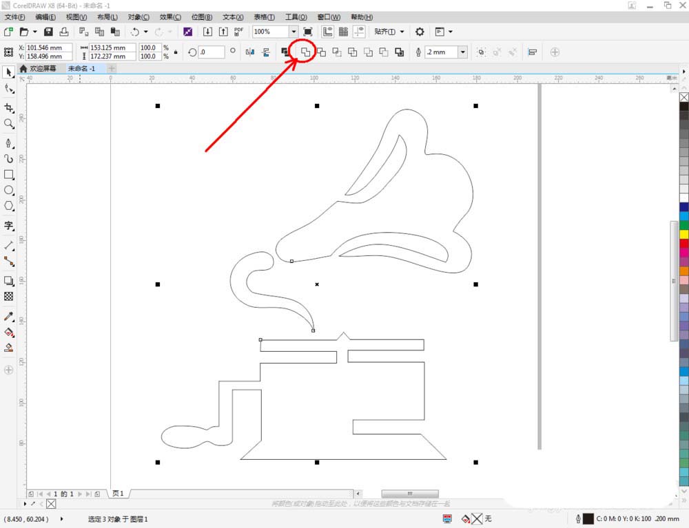 5、点击【选择工具】,选中所有图案后,点击【合并】将所有图案合并为一体。选中合并后的图案,鼠标左键点击右边色板中的黑色色块将图案填充为黑色,这样我们的留声机图标便全部制作完成了。
